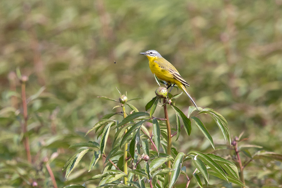 Een gele kwikstaart had een knop van een pioenroos uitgekozen als uitkijkpunt. Op de tweede foto is te zien hoe er net op dat moment een insect vlak voor het vogeltje langs vliegt.