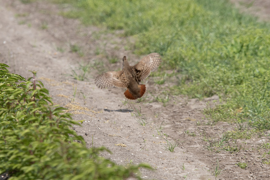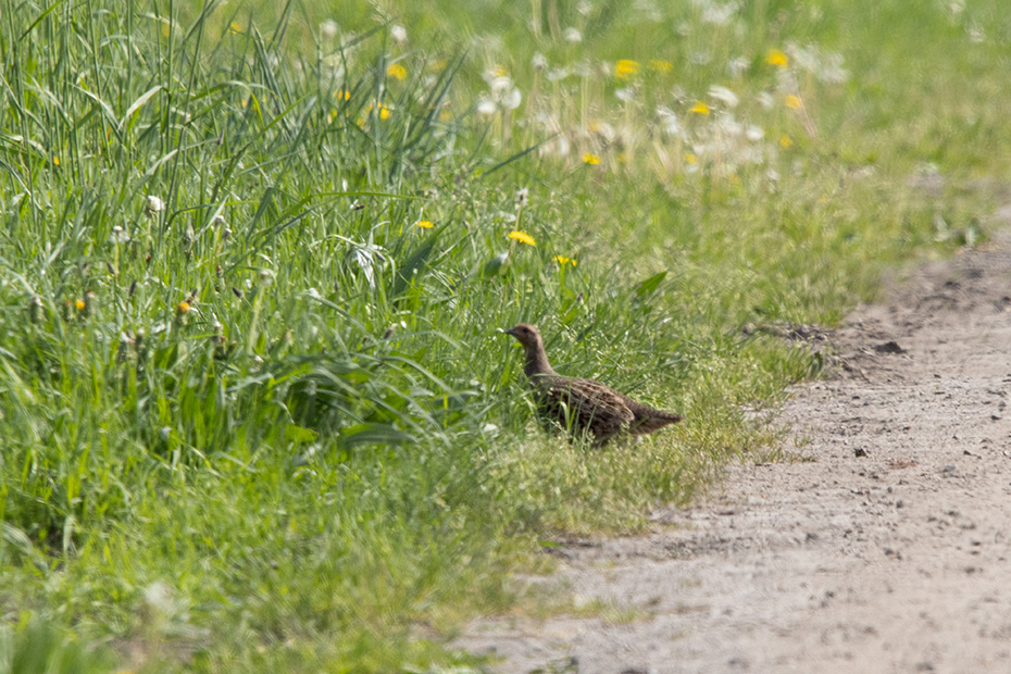 Even verderop stak plotseling een vogel de weg over. In eerste instantie dacht ik aan een vrouwtjesfazant, maar al snel zag ik dat deze wat kleiner was. Ik vermoedde dat het een patrijs moest zijn. De vogel verdween in het gras langs de weg.