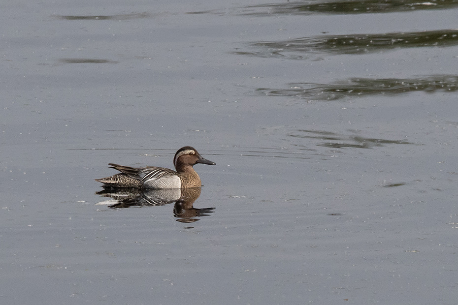 Op de grote plas, iets meer naar rechts, kwamen een aantal eenden voorbij. De kuifeend is voor mij een bekende verschijning. De andere soorten zijn wat uitzonderlijker. Op foto twee en drie is een zomertaling te zien, een fraaie en wat schuwere soort. Op de vierde foto zwemt een witoogeend voorbij, herkenbaar aan zijn opvallende lichte oog en compacte postuur.