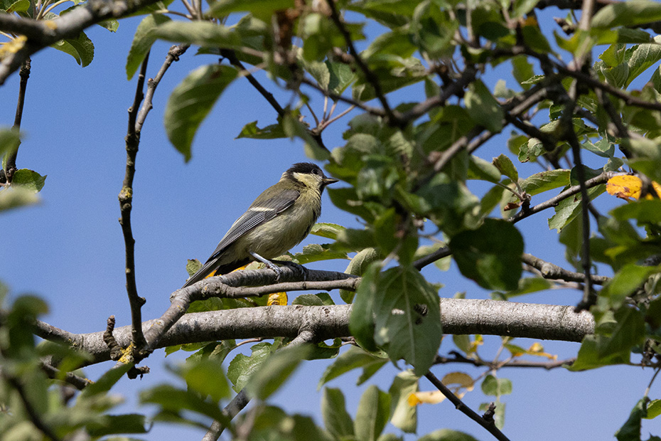 Terwijl ik de wespen stond te fotograferen landde er een eindje verderop een jonge koolmees in de boom. Koolmezen eten o.a. wespen en bijen en dan met name de larven. Koolmezen plunderen soms wespennesten om bij de larven te komen, vooral in het broedseizoen als ze veel eiwitten nodig hebben voor hun jongen. Bij het verorberen van een volwassen wesp met angel pakken koolmezen dit slim aan. Ze grijpen de wesp en verwijderen vaak eerst de angel en het achterlijf. Daarna eten ze het kopje en het borststuk op, het gedeelte waar de meeste eiwitten in zitten.