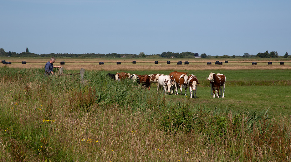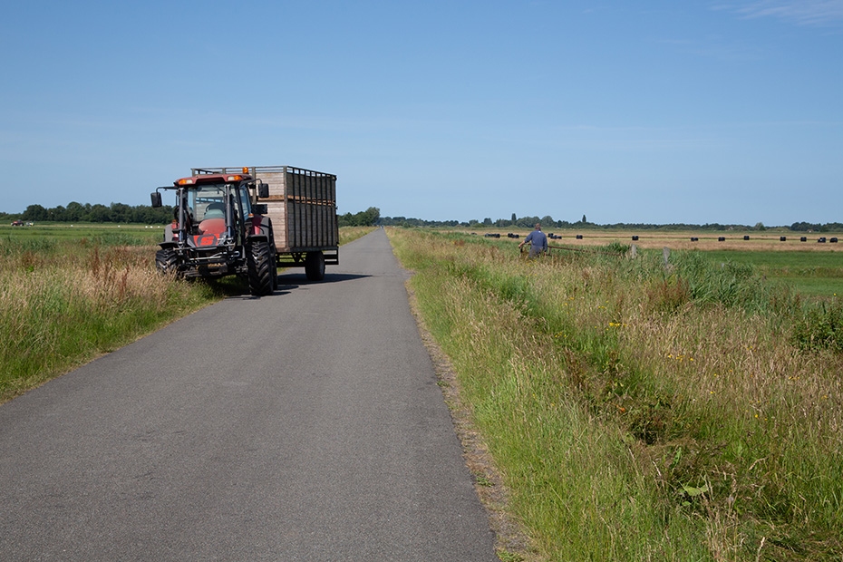 Iets verderop ontmoetten we een boer die net zijn pinken had uitgeladen. Pinken zijn jonge vrouwelijke runderen van ongeveer één tot twee jaar oud die nog geen kalf hebben gekregen en dus nog geen melkkoe zijn. Eerst bleven de pinken dicht bij de boer staan. Toen hij met zijn tractor wegreed, liepen ze trouw met hem mee, totdat een hek hen tegenhield. Het was duidelijk: een boer kent zijn koeien, en de koeien kennen hun boer. 😉