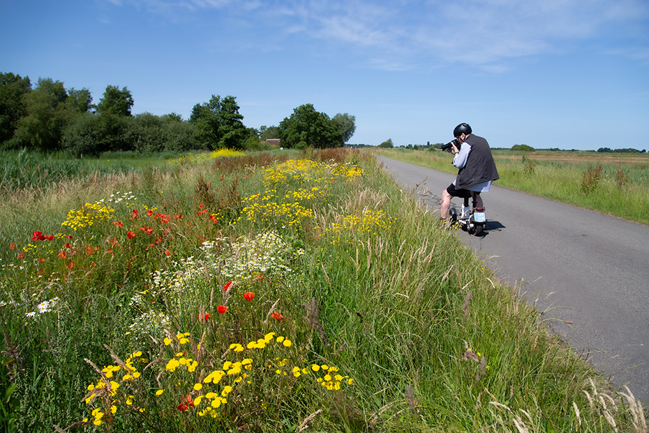 Een paar honderd meter verderop nodigde een bloemrijke berm ons uit om weer even te stoppen. Het was een waar feest om te zien. De bloemen werden druk bezocht door verschillende vlinders. Een klein geaderd witje wilde wel voor mij poseren. Terwijl ik over de weg liep, probeerde ik een rietzanger op de foto te krijgen. De rietzanger liet zich prachtig horen en was af en toe ook even te zien, maar zodra ik mijn camera richtte, was de vogel alweer gevlogen.