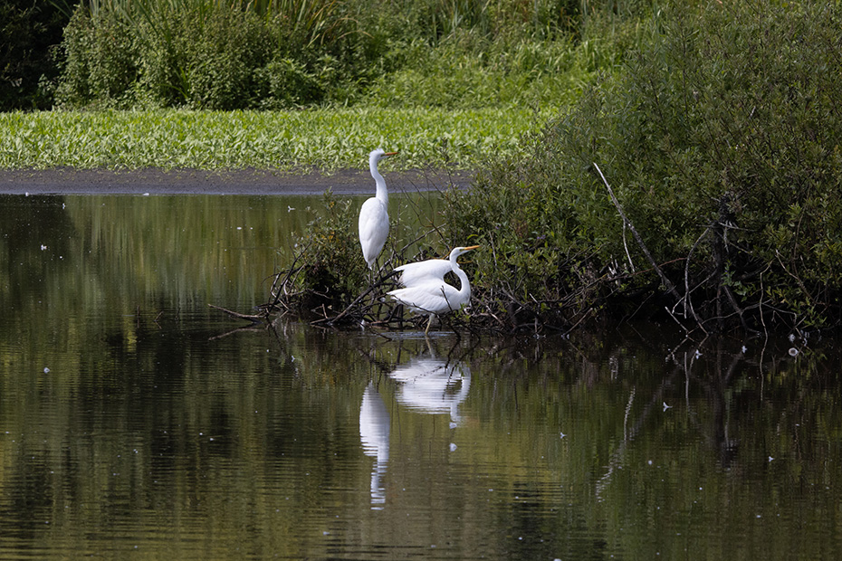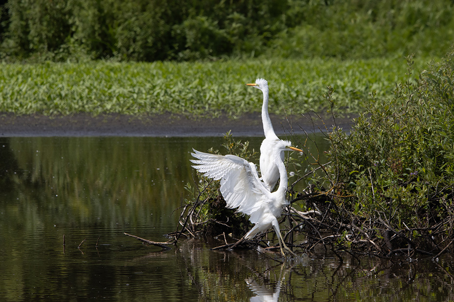 Even later verschenen er twee zilverreigers in beeld. Ze landden op een klein eilandje voor de hut. Het leken mij jonge exemplaren, al is dat lastig met zekerheid te zeggen. Jonge vogels hebben namelijk dezelfde kleurkenmerken als volwassen dieren, alleen oogt hun verenkleed vaak wat minder strak. Af en toe hapten ze een insect uit de lucht. Insecten zijn een licht verteerbare en energierijke snack, zeker voor opgroeiende vogels.