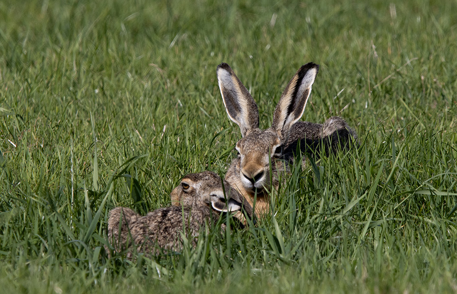 Even verderop, in een aangrenzend weiland, ontdekte ik een moederhaas met haar jong. Ze lagen rustig in het gras, niet ver van het weggetje. Zonder ze te verstoren kon ik er op mijn gemak foto’s van maken.