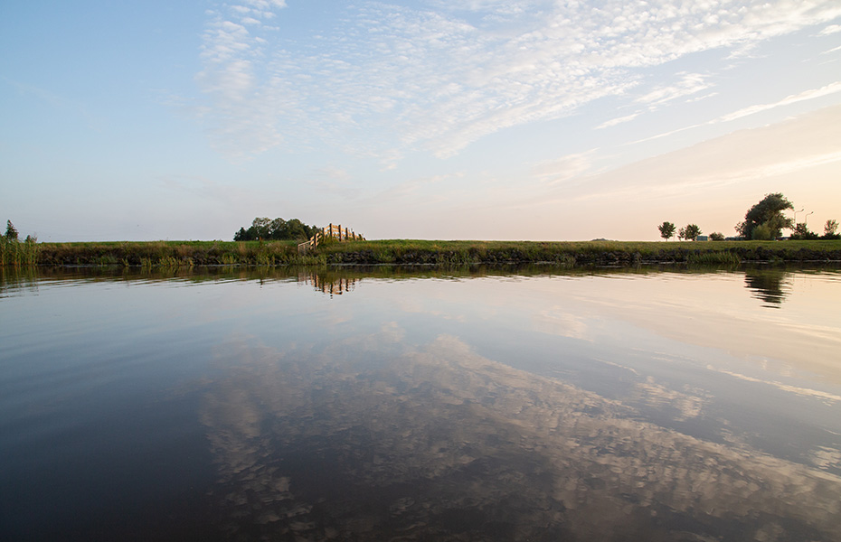Ik zat in een bootje van de campingeigenaren, aangemeerd aan de wal. Om me heen was het stil, het water spiegelglad. Ik speelde met de weerspiegelingen van de lucht, de bomen en af en toe een voorbijglijdende wolk. De grote boten lagen stil; de bruggen waren inmiddels gesloten, waardoor de vaarroute was afgesloten. Af en toe gleed er nog een kleiner bootje voorbij, zacht kabbelend door het water.