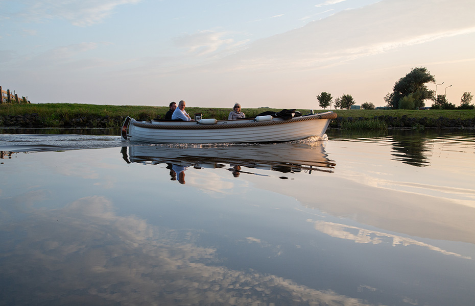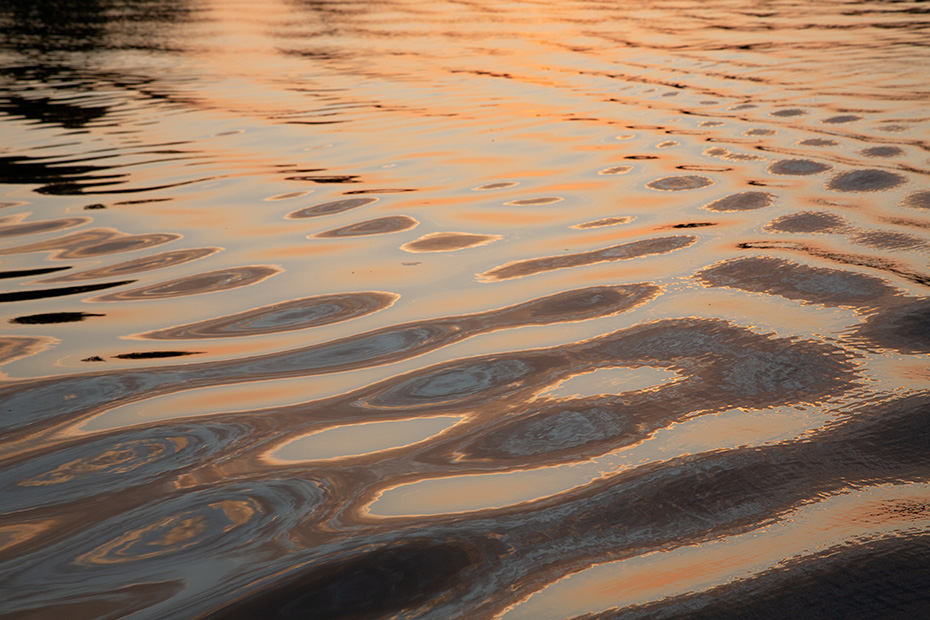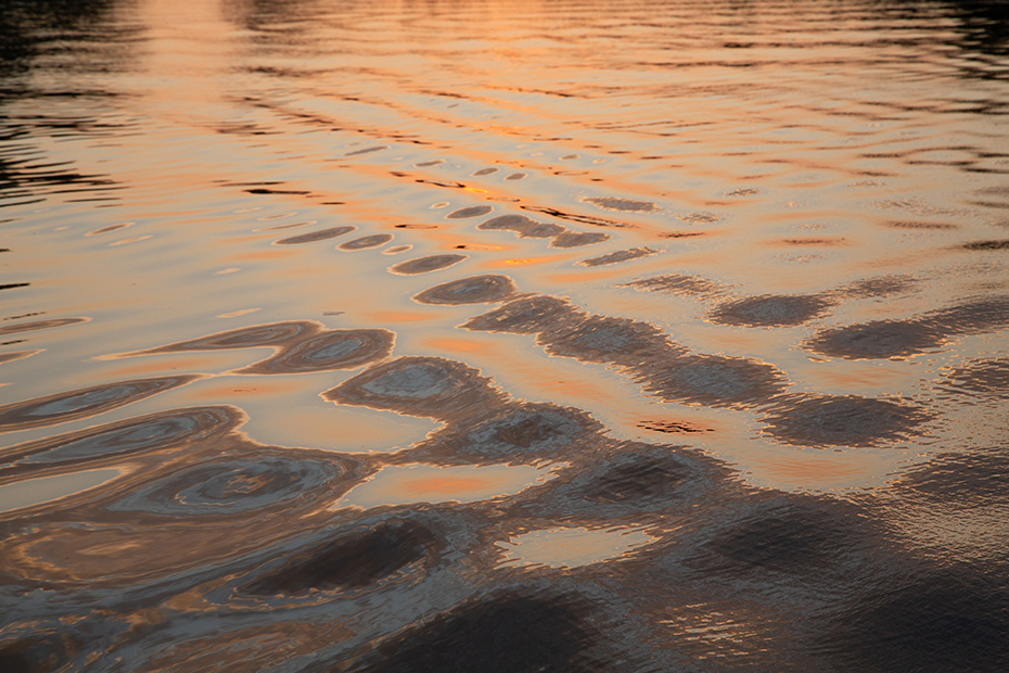 Even later kwam dezelfde sloep weer terugvaren. De golfslag die het bootje achterliet, mengde zich met het warme rood van de ondergaande zon en vormde een bijzonder spel van licht en lijnen op het wateroppervlak. Een klein moment van magie.