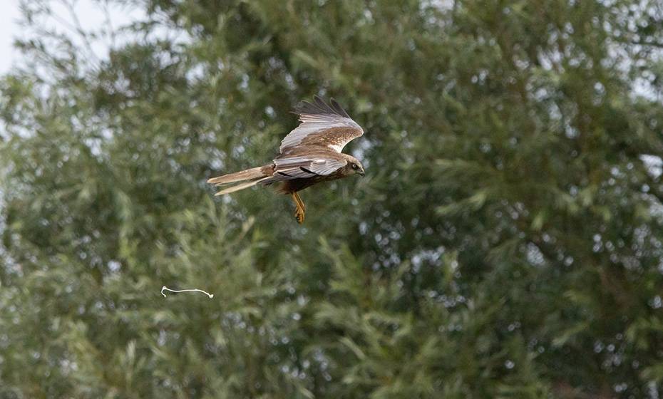Op het volgende moment vloog er een bruine kiekendief langs de bosrand. Ik had geluk dat hij precies op ooghoogte voorbij kwam, want hoog in de lucht heb je al snel last van tegenlicht. Op de eerste foto is zelfs te zien dat de kiekendief een poepje laat vallen.