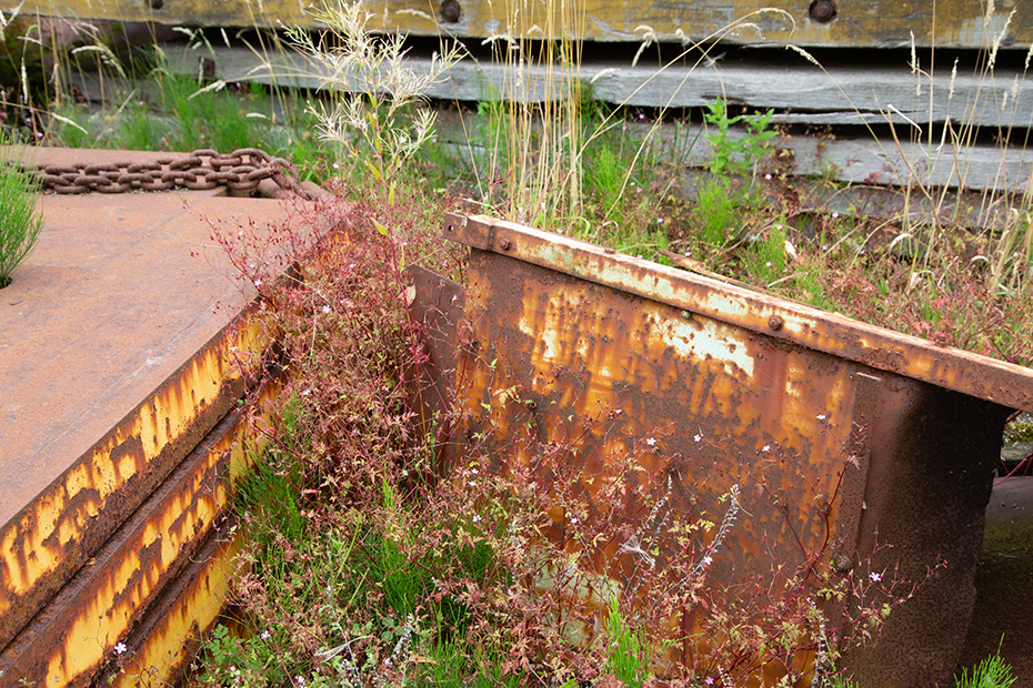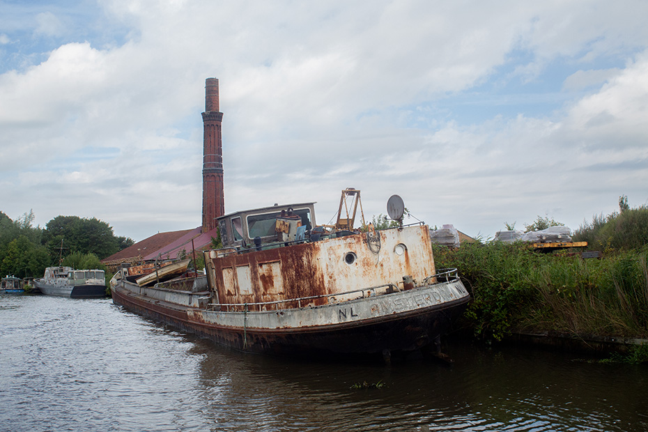 Aan het einde van de middag reed ik over de Wâlddyk terug naar de camping. Onderweg stopte ik nog even om vanaf de zuidkant een foto van de fabriek te maken. Enkele weken later kreeg ik een buitenkansje: dit keer voer ik mee op een boot en kwamen we langs de fabriek. Zo kon ik vanaf het water foto’s nemen van de vergankelijkheid van de fabriek en de aangemeerde schepen.