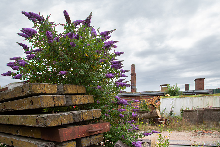 Het terrein was volledig afgesloten en een bordje bij het hek maakte duidelijk dat het daar ophield. Toch ontdekte ik een paar plekken waar de spijlen wat verder uit elkaar waren gebogen. Dat gaf precies genoeg ruimte om mijn objectief ertussen te steken en foto’s te maken. Langs het hek liep het fietspad Jaachpaad, waardoor ik zonder op verboden terrein te komen rustig kon wandelen en fotograferen.