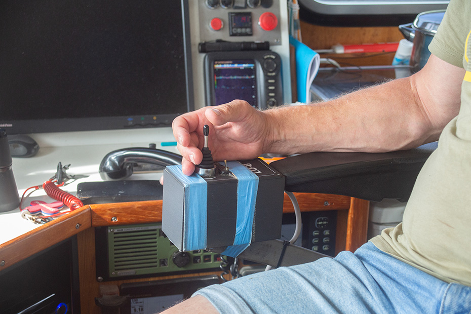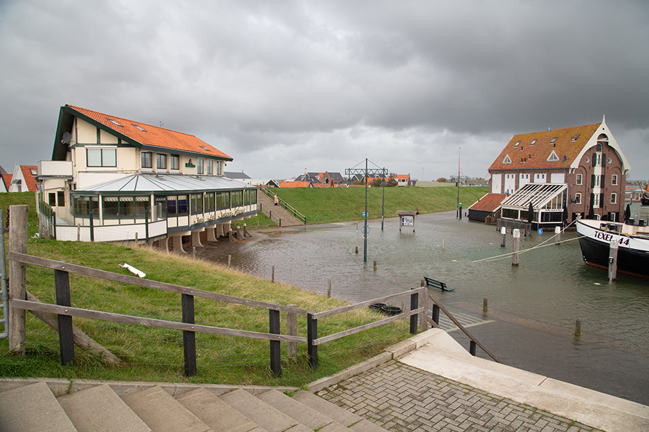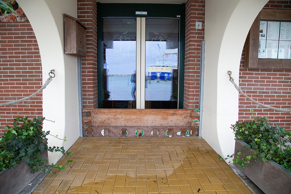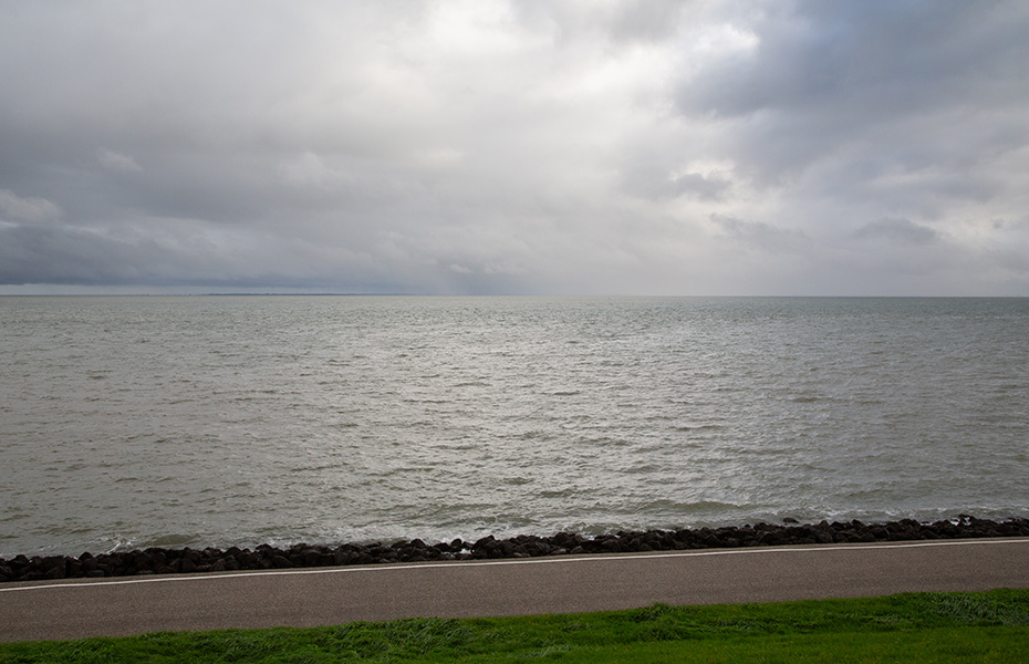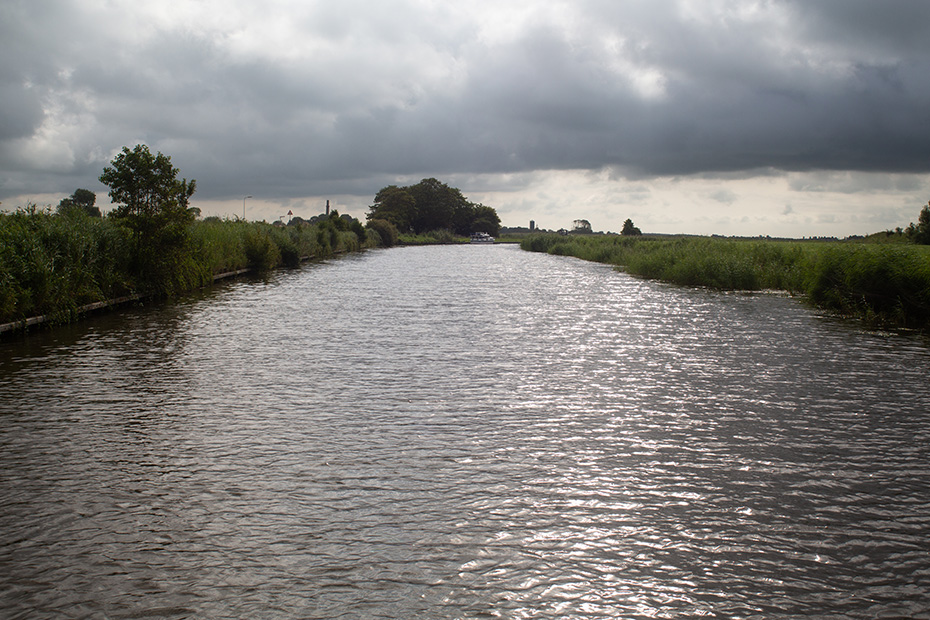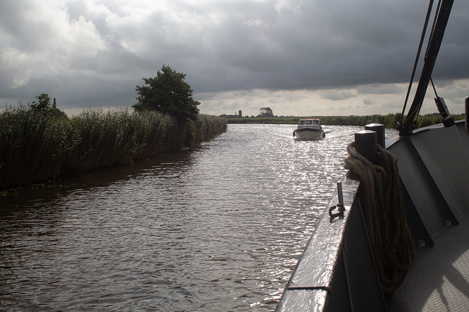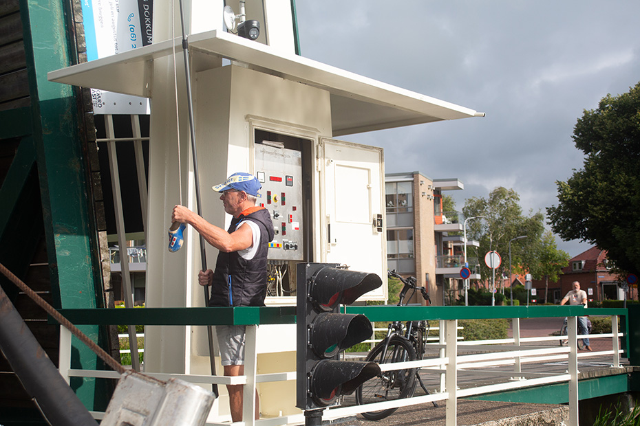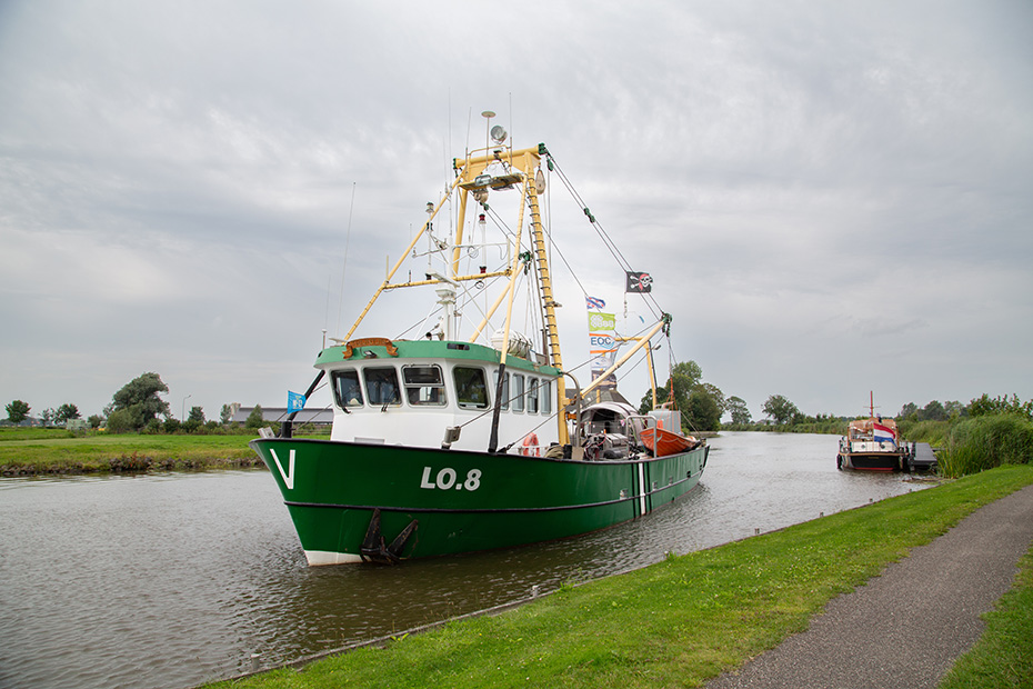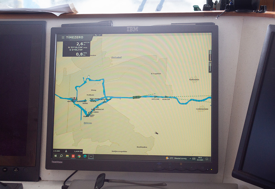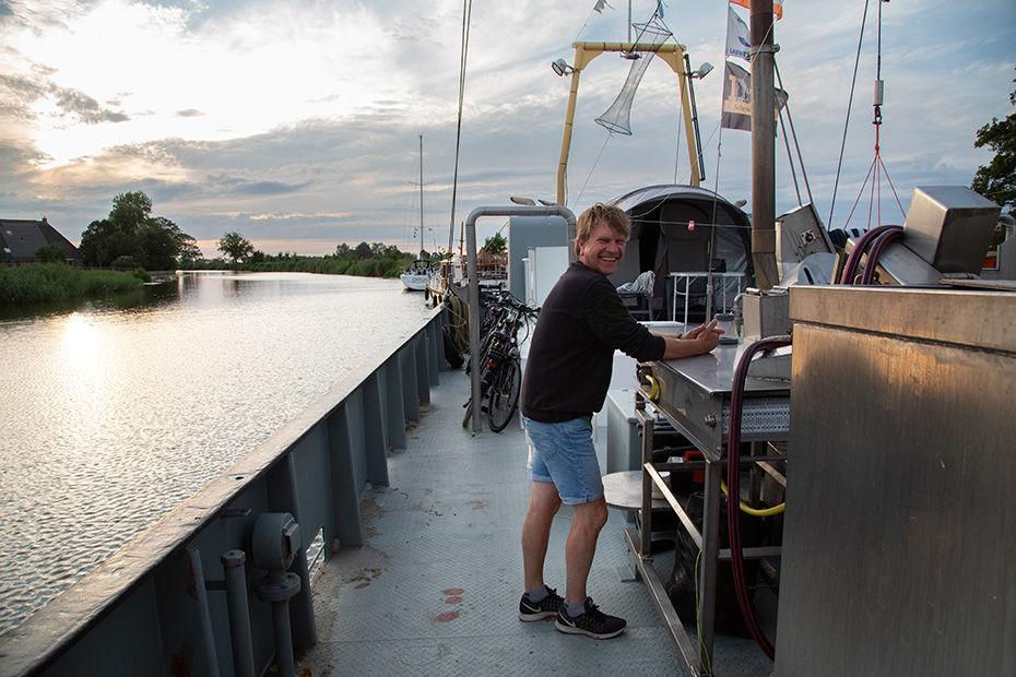 Vanaf Dokkum voeren we verder over het Dokkumergrootdiep. De dreigende lucht trok om ons heen en leverde een sfeervol schouwspel op. We passeerden de oude steenfabriek, waar ik eerder al deze serie over maakte. De kotter wordt bestuurd met een joystick. Het oogt ontspannen en eenvoudig, maar ik heb met eigen ogen gezien hoeveel vakmanschap ervoor nodig is om zo’n schip soepel door binnenwateren, bruggen en sluizen te manoeuvreren.