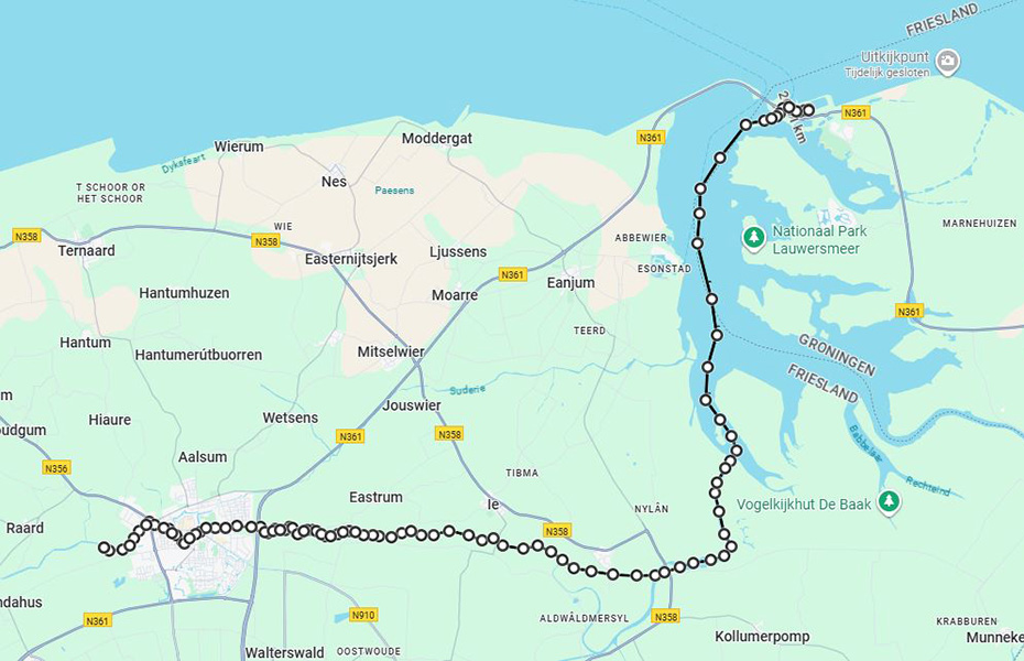 Op een kaartje in Google Maps heb ik achteraf de route bekeken en de afstand berekend: in totaal legden we 27 km af. Bekijk Google Maps om in te zoomen op dit traject.