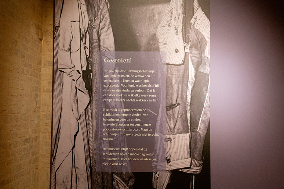 Op 14 juli 1984 werden drie schilderijen van Jopie Huisman gestolen uit galerie ’t Weefhuis in Nuenen, waar hij op dat moment exposeerde naast werken van Vincent van Gogh. Het ging om de werken Handschoenen (1976), Merelnest (1981) en De drie lotgenoten (1981).