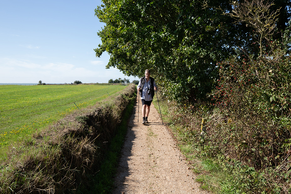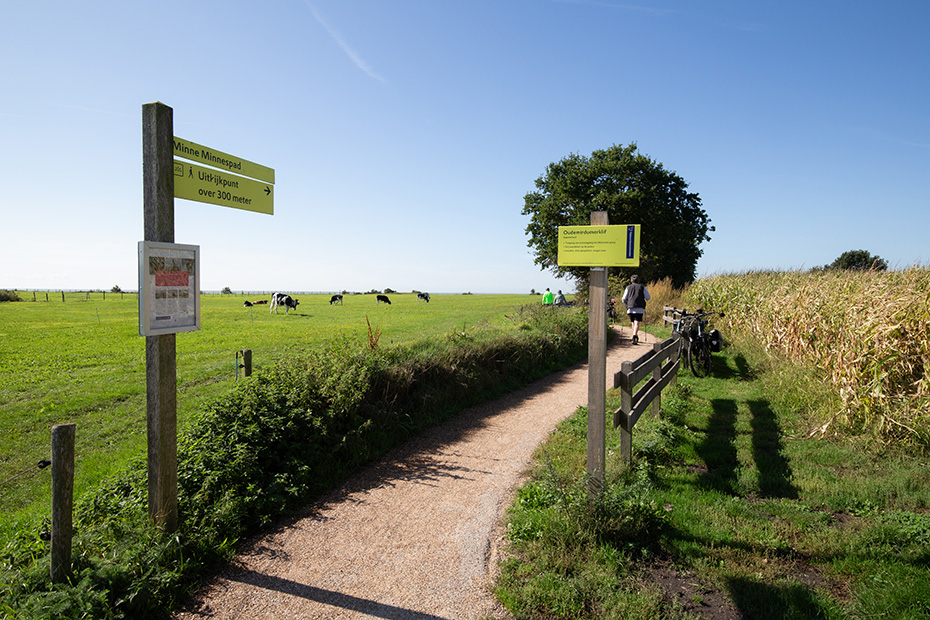 Onze eerste stop was bij het Oudemirderklif. Vanaf de auto is het ruim 300 meter wandelen naar het klif. Voor Jan is dat, ondanks het keurig verharde pad, een flinke afstand. Met behulp van zijn stokken kan hij het gelukkig nog overbruggen, maar hij moet daar wel een goede dag voor hebben. Het was die dag stralend weer. We hebben volop genoten van het weidse uitzicht en de schitteringen van de zon op het water.