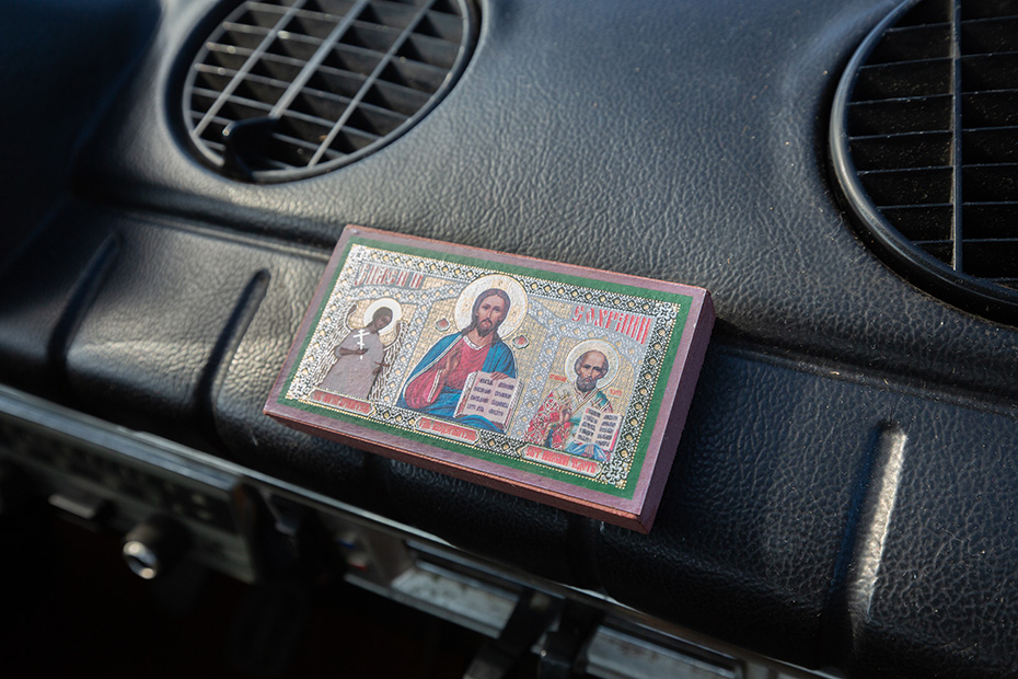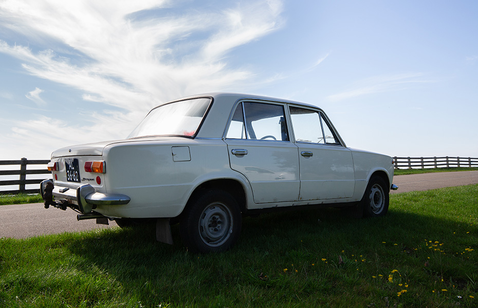 Terwijl ik een foto maakte richting het zuidoosten, kwam er een oldtimer aangereden. Al snel vermoedde ik dat het een Lada was. De eigenaar vond het prima dat we er een fotoserie van maakten en vertelde enthousiast over de auto en de herkomst. Deze Lada was geïmporteerd uit Oekraïne. In de auto troffen we een orthodox icoon aan, wat roebels én zelfs een lege Vodkafles, details die helemaal bij de sfeer pasten.