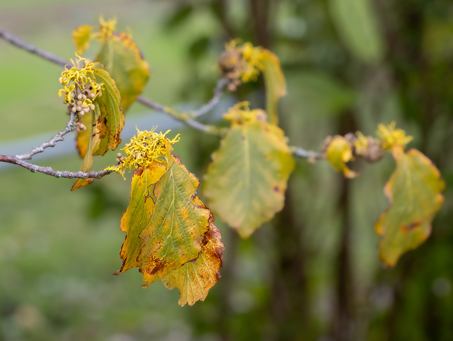 Gisterochtend zaten mijn man en ik achter het voorraam koffie te drinken toen ons oog viel op de toverhazelaar. Hij staat in bloei! De struik staat naast onze oprit, maar ondanks het dagelijks in- en uitstappen was het ons nog niet opgevallen. De gele bloemetjes mengen zich subtiel met de geelgekleurde herfstbladeren, waardoor ze bijna wegvallen.
