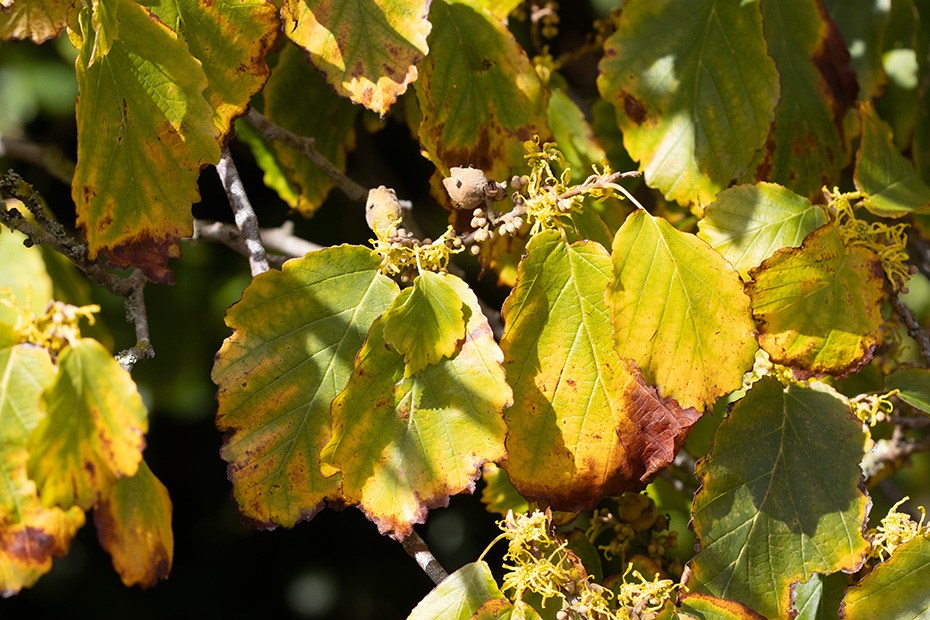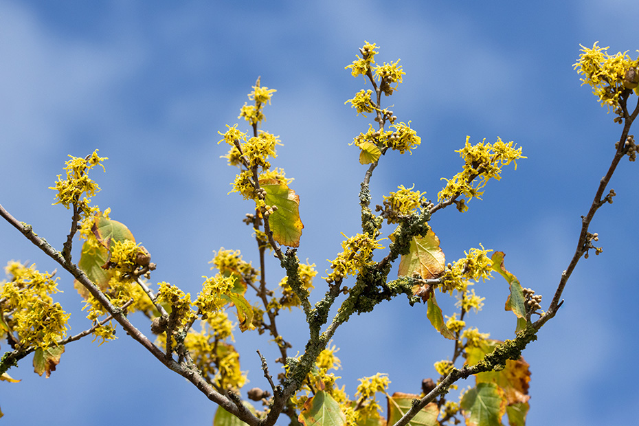 Dat de toverhazelaar nu al in bloei staat, is best bijzonder. Normaal gesproken bloeit hij pas in de winter. Uit nieuwsgierigheid ben ik eens op internet gaan kijken en ook even door mijn oude weblogberichten gebladerd. Daar kwam ik een bericht tegen uit oktober 2013, waarin ik schreef over de bloei in de herfst van dezelfde toverhazelaar. In dat bericht verwijs ik naar eerdere foto’s waarbij de toverhazelaar toch echt in de winter bloeit. In februari 2010: de bloemetjes bedekt met sneeuw en in januari 2011: de bloei met rijp