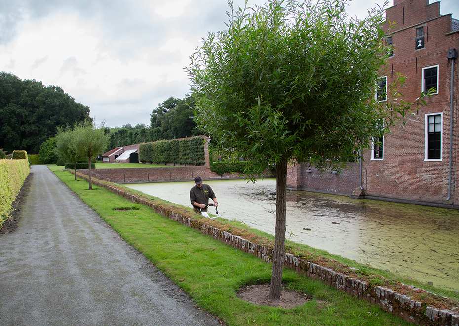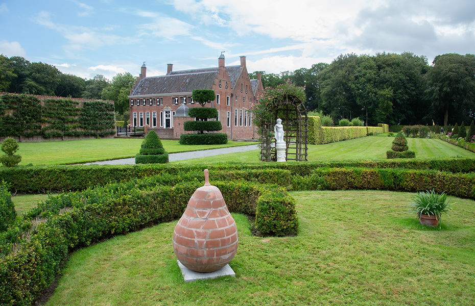 Na de boeiende rondgang binnen wandelde ik door de tuin. Het is een prachtig aangelegde tuin met strakke lijnen en mooie zichtassen. De peer op de eerste foto is een kunstwerk van Judith Hopf. Tussen de bloeiende zonnehoed en lavendel zoemden talloze insecten. Toen ik de hovenier fotografeerde, onderbrak hij even zijn werk om een praatje te maken. Hij vertelde enthousiast over de tuinen van Menkemaborg, over dit deel van de provincie Groningen, over de akkerbouw, over de zwaarste aardbeving en nog veel meer. Het werd een onverwacht maar waardevol gesprek.