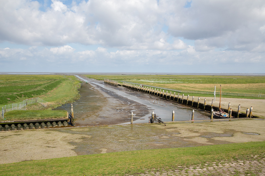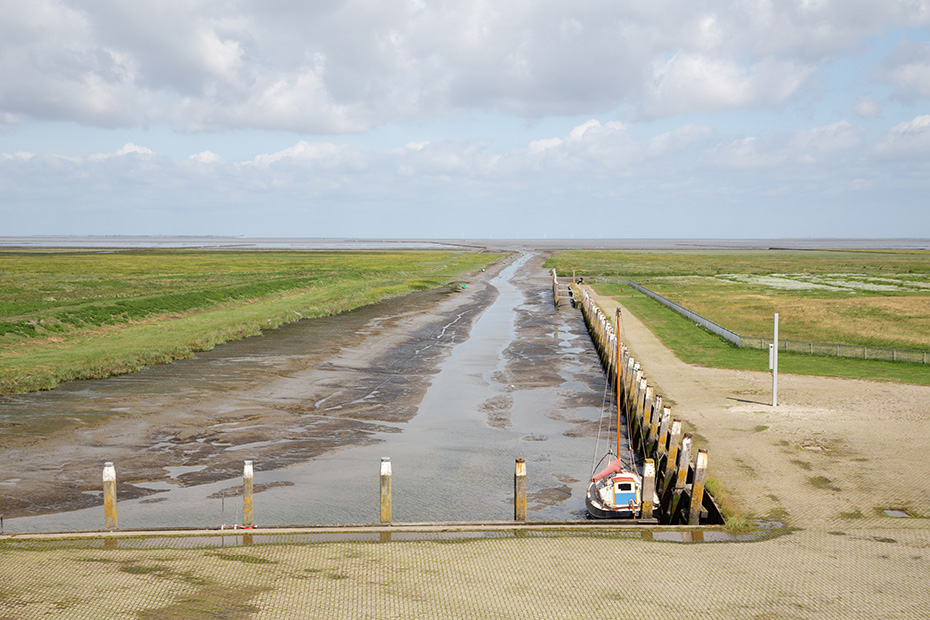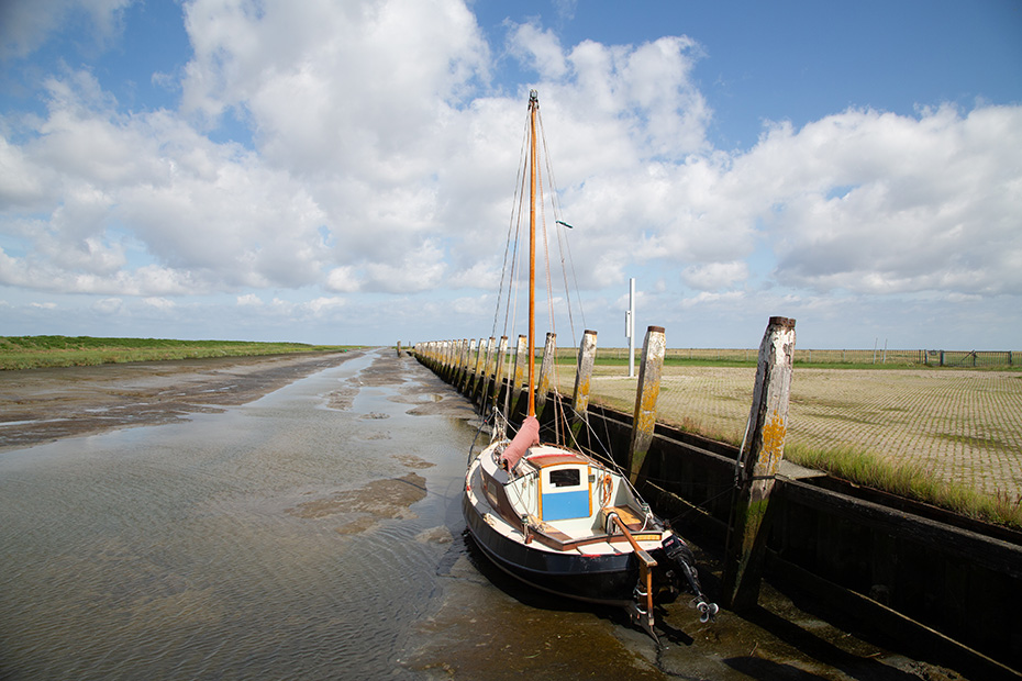 Gelukkig lag de boot van vorige keer nog in de haven. Dat maakte in één oogopslag duidelijk hoe afhankelijk deze plek is van het tij: de drooggevallen boot kon geen kant op. Op de kwelder liepen een man en een vrouw, die even later pauzeerden om misschien in alle rust te genieten van het landschap.
