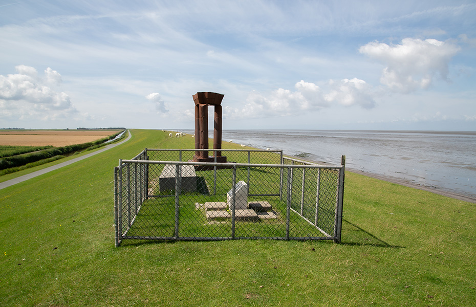 Na ons afscheid vervolgde ik mijn weg. Bij het hek las ik op het informatiebord dat de Wellington R3202 hier tijdens de Tweede Wereldoorlog is neergestort. Over de top van de Waddendijk liep ik tussen de schapen naar de markering en het monument.