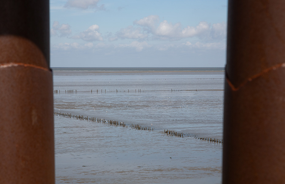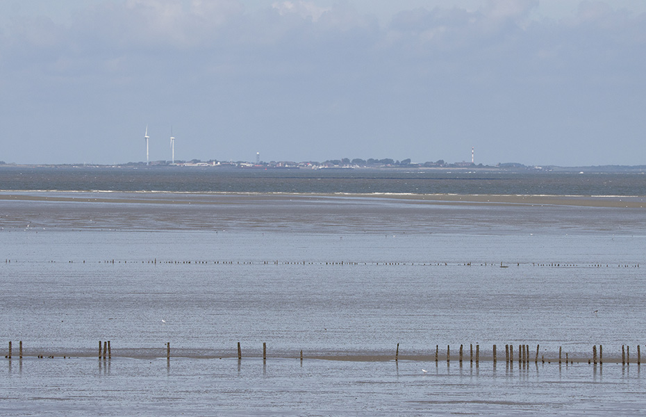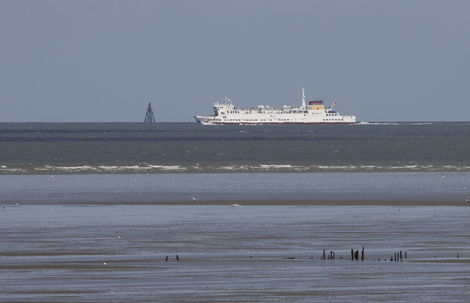 Vanaf dit punt aan de Waddenzee heb je ook uitzicht op het Duitse eiland Borkum. In de verte zag ik een veerboot die koers zette naar het eiland.