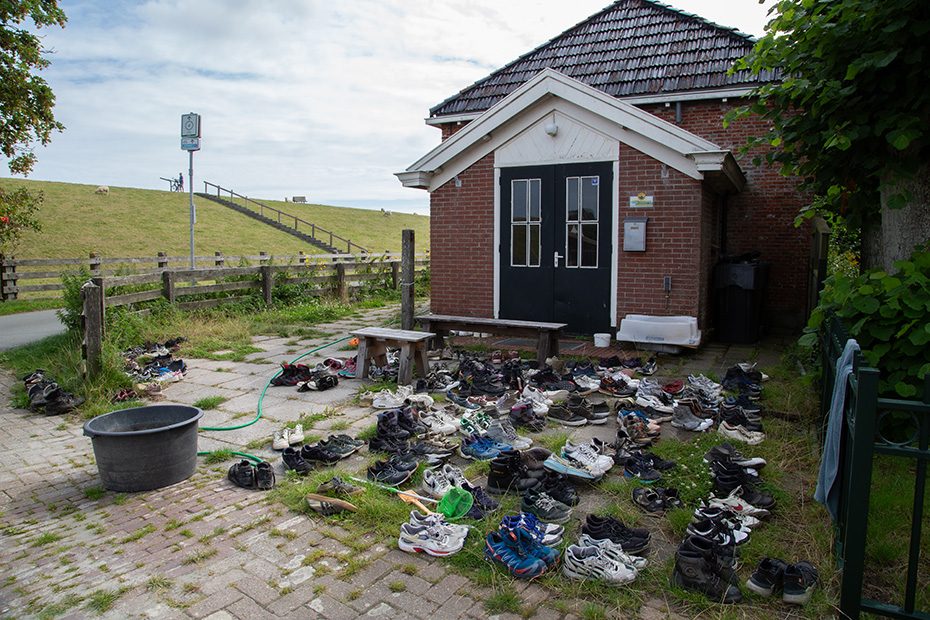 We liepen langs de plek waar de wadlooptochten beginnen. Grappig om al die wadloopschoenen bij elkaar te zien – klaar voor een tocht door het slik van het Wad.
