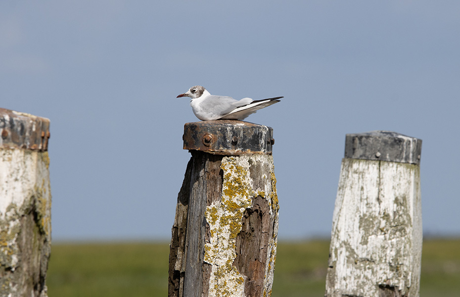 Ik wandelde langs de meerpalen, die duidelijk tekenen van verwering begonnen te vertonen. Op één ervan had een kokmeeuw (in overgang van zomerkleed naar winterkleed) plaatsgenomen, alsof hij een moment van rust nam.