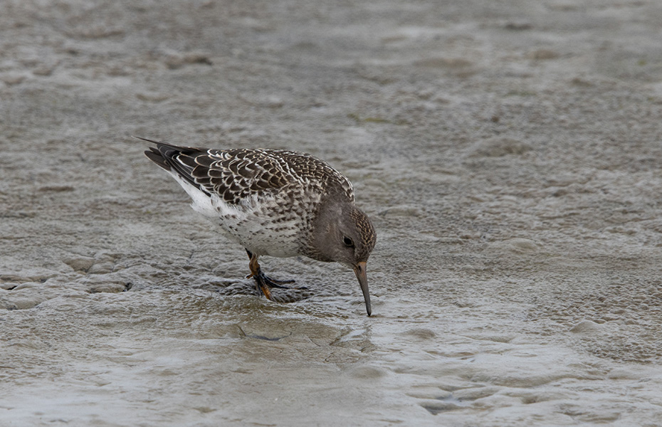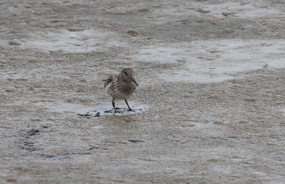 Op het slik foerageerde een paarse strandloper. Deze vogel dankt zijn naam aan het paarsbruine winterkleed. In de zomer is hij wat bruiner, met meer contrasterende zwarte en rossige tinten op de rugveren. De borst is dan fijner gestreept, en de karakteristieke paarsbruine glans verdwijnt grotendeels.
