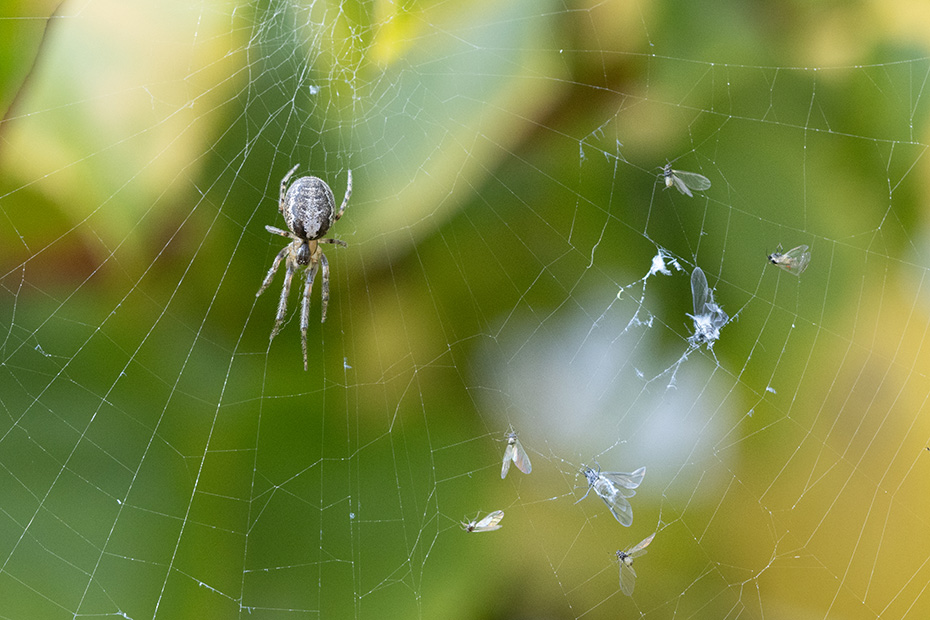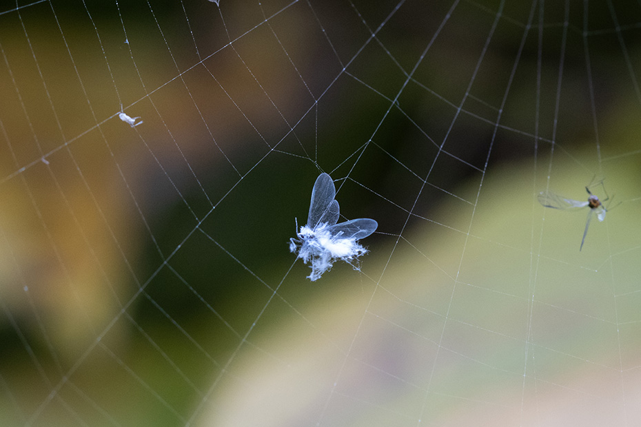 Vanmiddag vloog er in onze voortuin een ontelbaar aantal insecten rond. Ze waren bijna voortdurend in beweging, waardoor het me aanvankelijk niet lukte om ze te fotograferen. Totdat ik in de klimhortensia meerdere spinnenwebben ontdekte met daarin de gevangen insecten. Dat was een gelukje: zo kon ik ze dan toch op de foto zetten. Daarvoor gebruikte ik de macrolens.