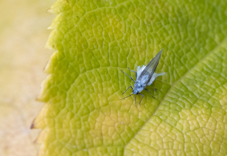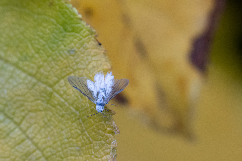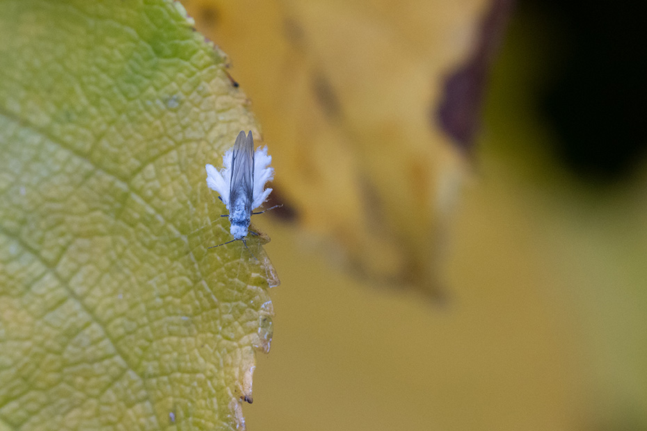 Het was wel een zoektocht voordat ik wist wat dit voor piepkleine insecten waren. Obsidentify gaf niet direct uitsluitsel, Via een foto op Perplexity kwam ik terecht op deze site die duidelijkheid bracht. Het blijkt te gaan om wollige bladluizen. Ik had ze wel in eerdere jaren zien rondvliegen, maar tot vandaag had ik me er niet in verdiept.