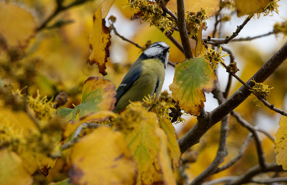 En als ik dan tussen de herfstbladeren van de toverhazelaar een pimpelmees en koolmees zie, dan vind ik dat extra genieten. Deze foto’s maakte ik vanuit de woonkamer.