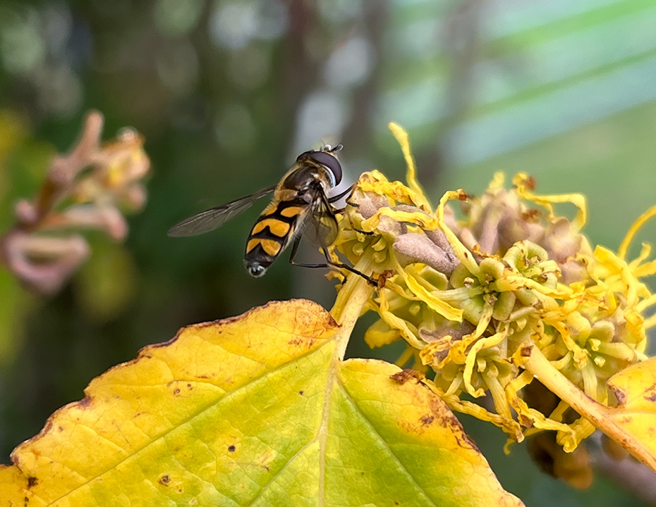 Ook tijdens de herfstdagen vliegen er nog insecten bij de toverhazelaar, zoals deze zweefvlieg. De eerste twee foto’s maakte ik met mijn telefoon.