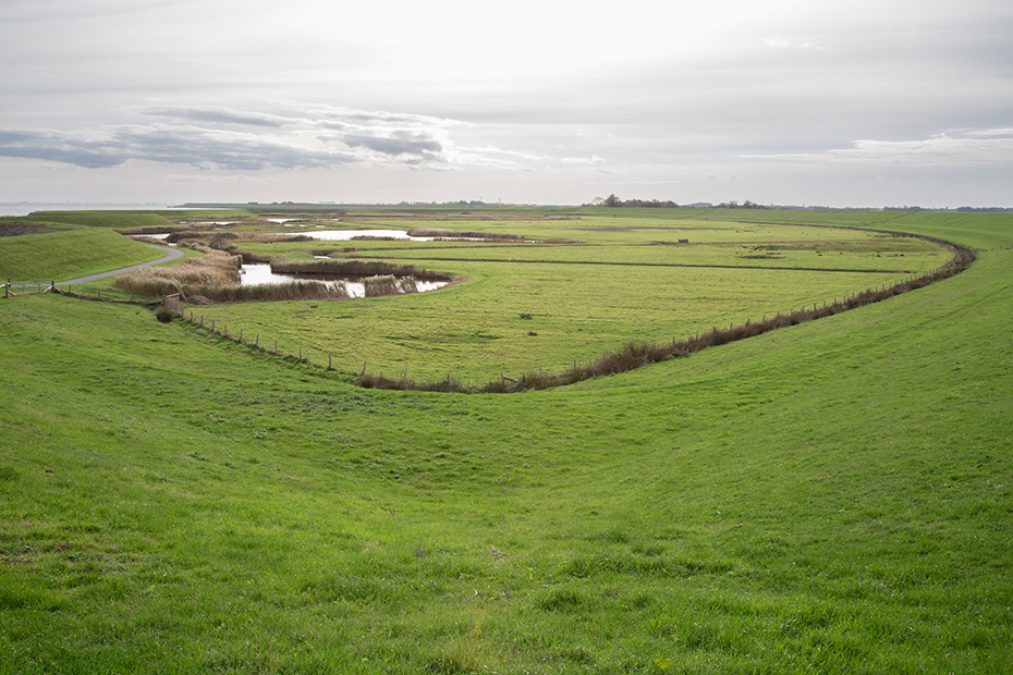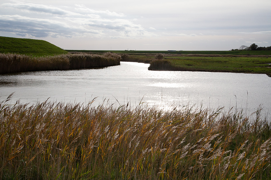 Op het verste punt maakte ik nog een overzichtsfoto. Daarop is goed te zien hoe het gebied wordt omsloten door twee dijken. De middag vorderde en de zon zakte langzaam, waardoor de rietpluimen in het tegenlicht een zachte, zilveren glans kreeg.