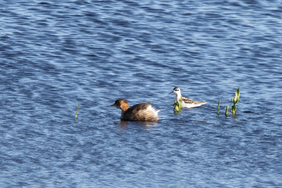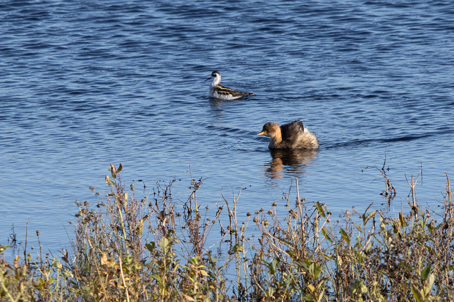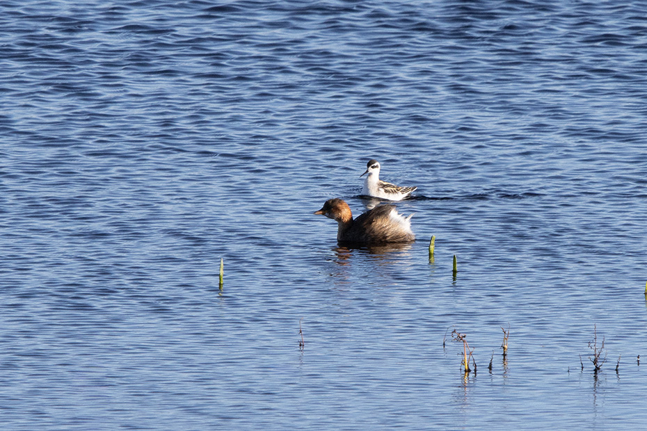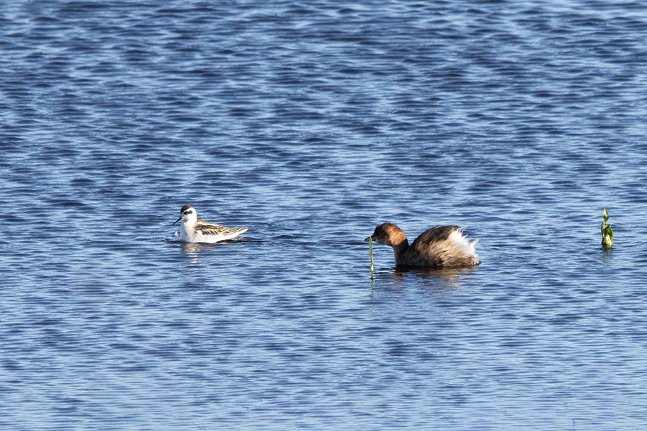 Vlak naast de grauwe franjepoot foerageerde een dodaars. Deze kleine fuut, de kleinste van Europa en een uitstekende duiker, bleef voortdurend in de nabijheid van de franjepoot. Het leek alsof hij handig profiteerde van het zoekwerk van zijn buur, waarbij kleine prooidiertjes opdwarrelden die hij vervolgens gretig oppikte. Een mooi voorbeeld van hoe vogels elkaar soms onbewust helpen tijdens het foerageren.