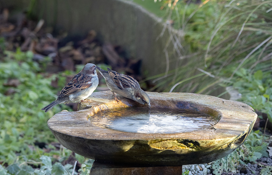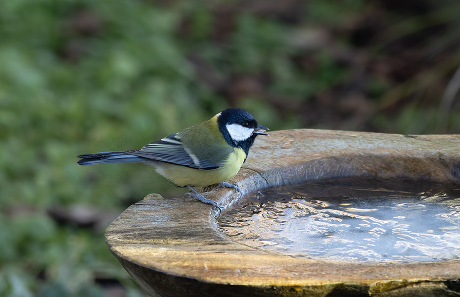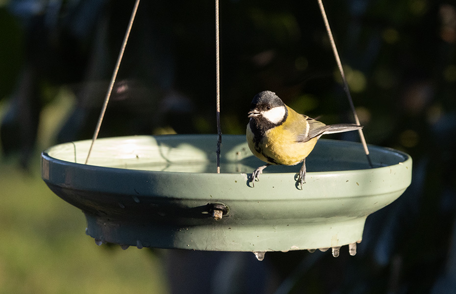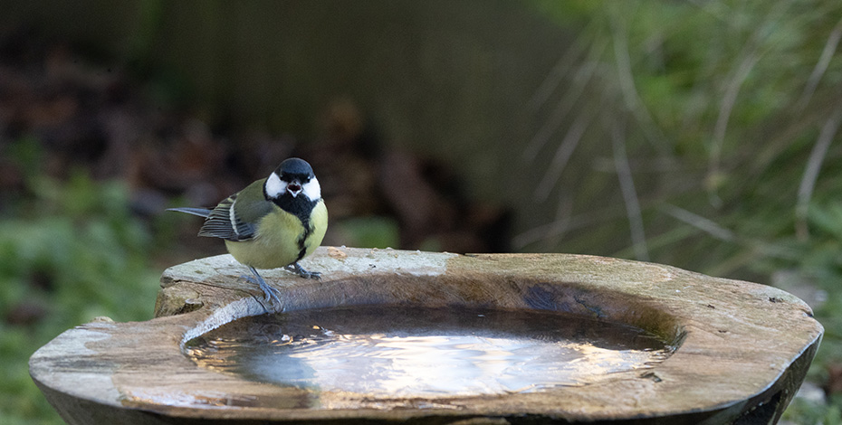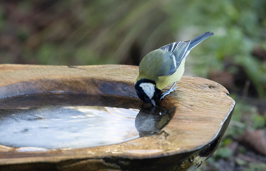 De luchtpomp hangt in de vijver om een wak open te houden. Bij de kippen vullen we het drinkwater regelmatig aan met warm water, zodat het niet bevriest. Ook de vogeldrinkbakken houden we scherp in de gaten; elk uur krijgen ze vers, warm water. De vogels maken er dankbaar gebruik van, wat een levendig schouwspel oplevert.