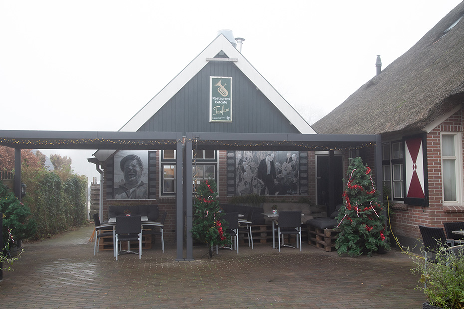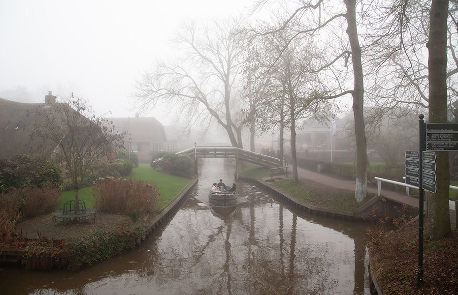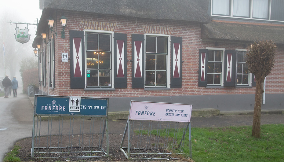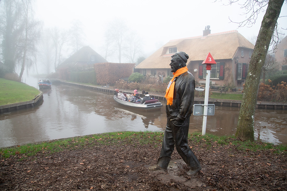 Even heb ik overwogen om terug te keren, maar uiteindelijk ben ik toch doorgereden naar Giethoorn. Dan maar een wandeling in de mist. Giethoorn werd ooit landelijk bekend door de film De Fanfare van Bert Haanstra. Aan die film herinneren nog altijd enkele monumenten in het dorp. Zo is er een monument ter ere van Haanstra, als ode aan zijn werk en zijn betekenis voor de Nederlandse filmgeschiedenis. Ook Café De Fanfare bestaat nog steeds en vormt een tastbare verbinding met dat verleden. Daarnaast staat het beeld van Albert Mol, die in de film een memorabele rol vertolkte.