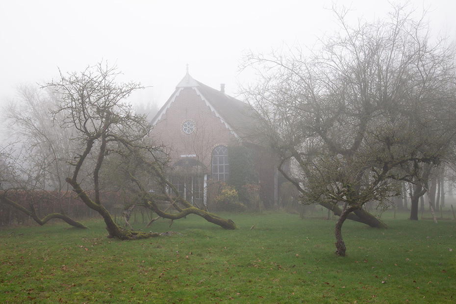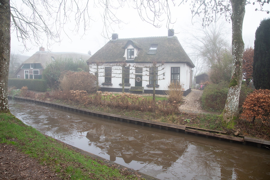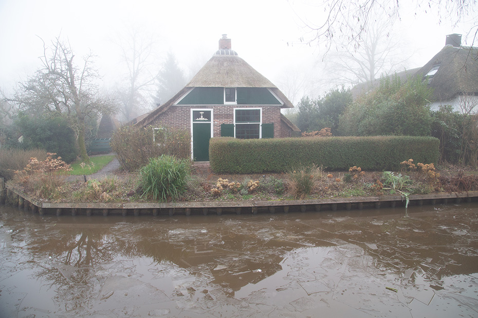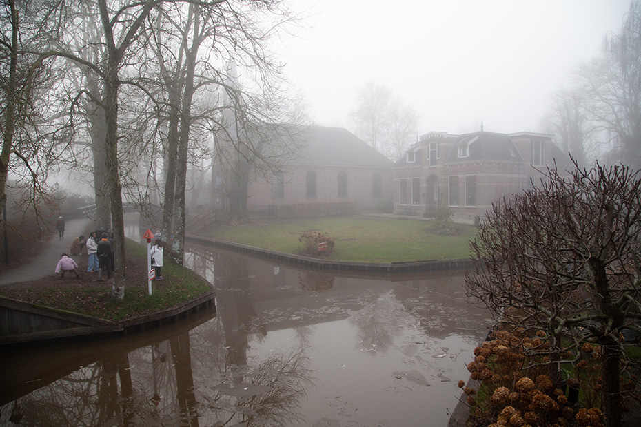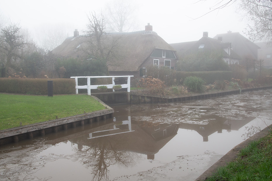Die nevel gaf het dorp een ingetogen, bijna tijdloze sfeer. Tijdens de kerstdagen had zich een mooi ijsvloer gevormd in de Dorpsgracht. Omdat de vorst niet heeft doorgezet, mocht er na een tijdelijk vaarverbod weer worden gevaren. Dat resulteerde in een gracht vol losgeslagen ijsschotsen, langzaam voortgeduwd door het waterverkeer. Mocht het op korte termijn opnieuw serieus gaan vriezen, dan is dat natuurlijk funest voor de schaatsliefhebbers, het ijs krijgt geen kans meer om egaal aan te groeien.