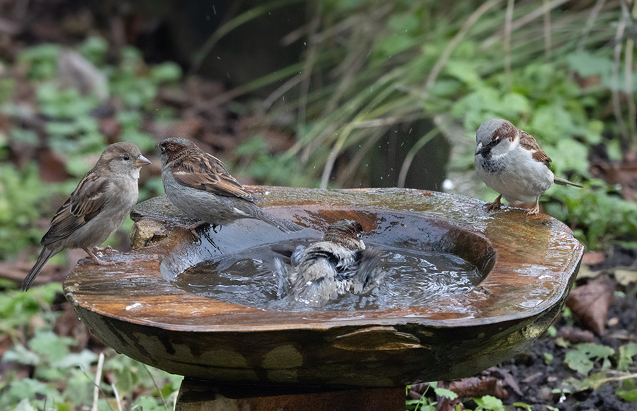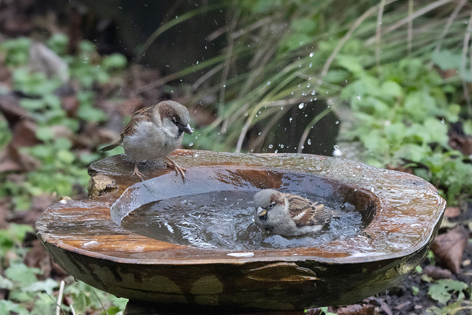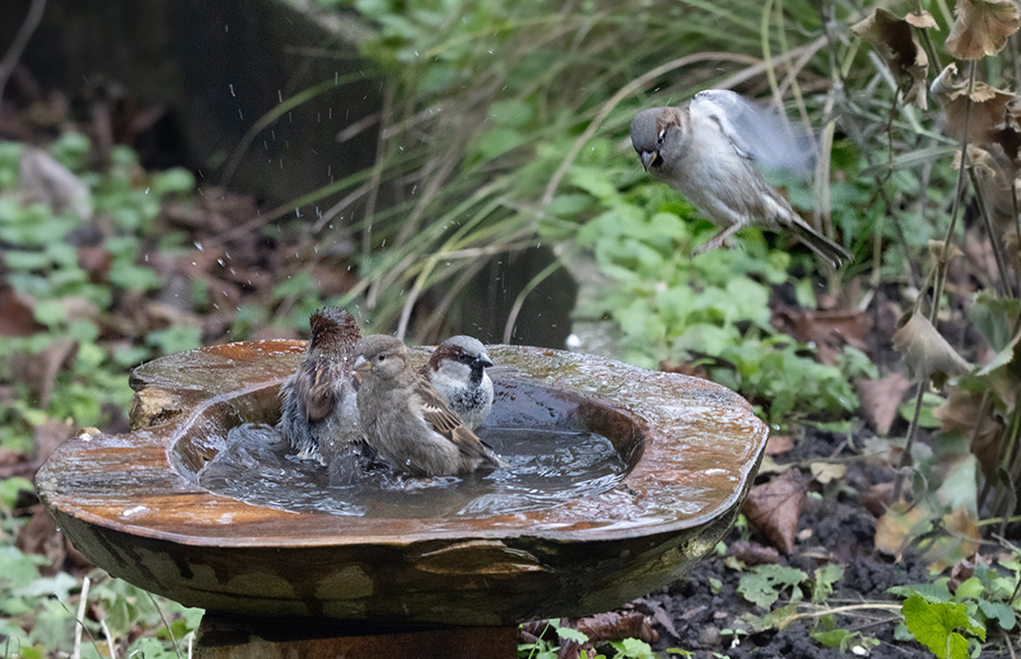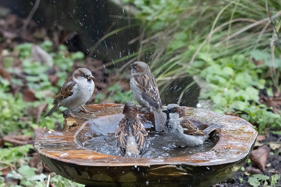 Aan het einde van de zondagochtend badderden de mussen in onze voortuin alsof hun leven ervan afhing. Ze plensden, fladderden en schudden het water alle kanten op. Ik kon het niet laten om er een fotoserie van te maken.