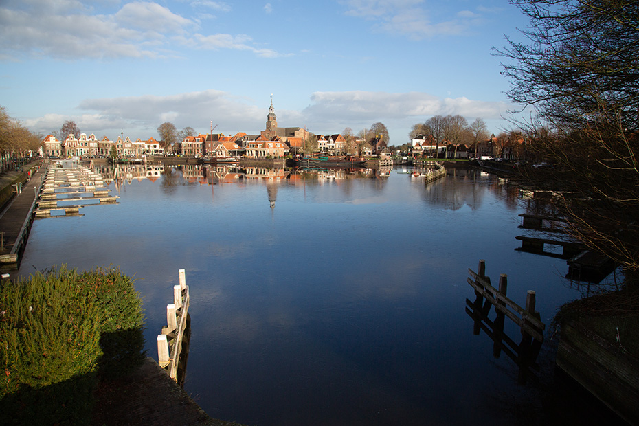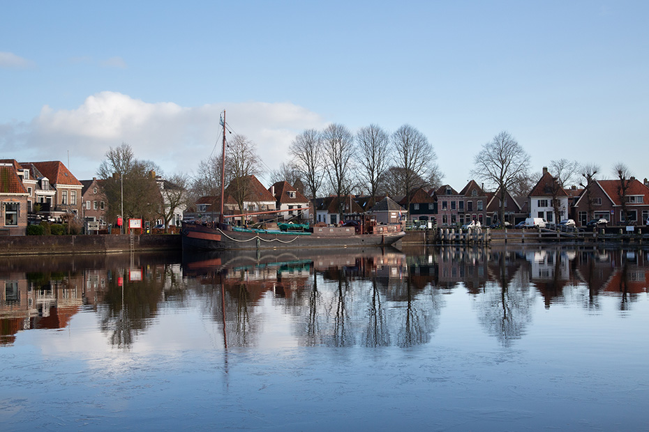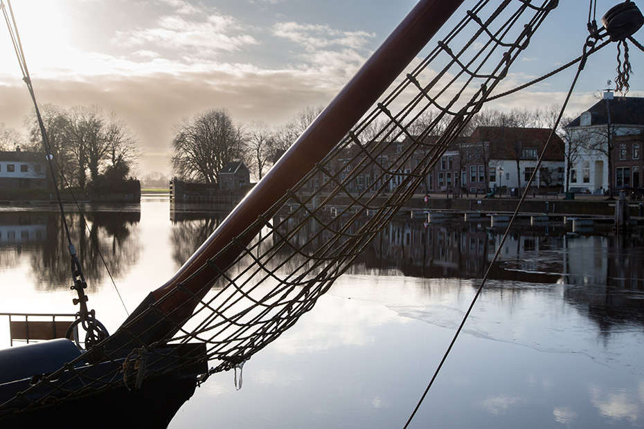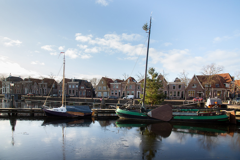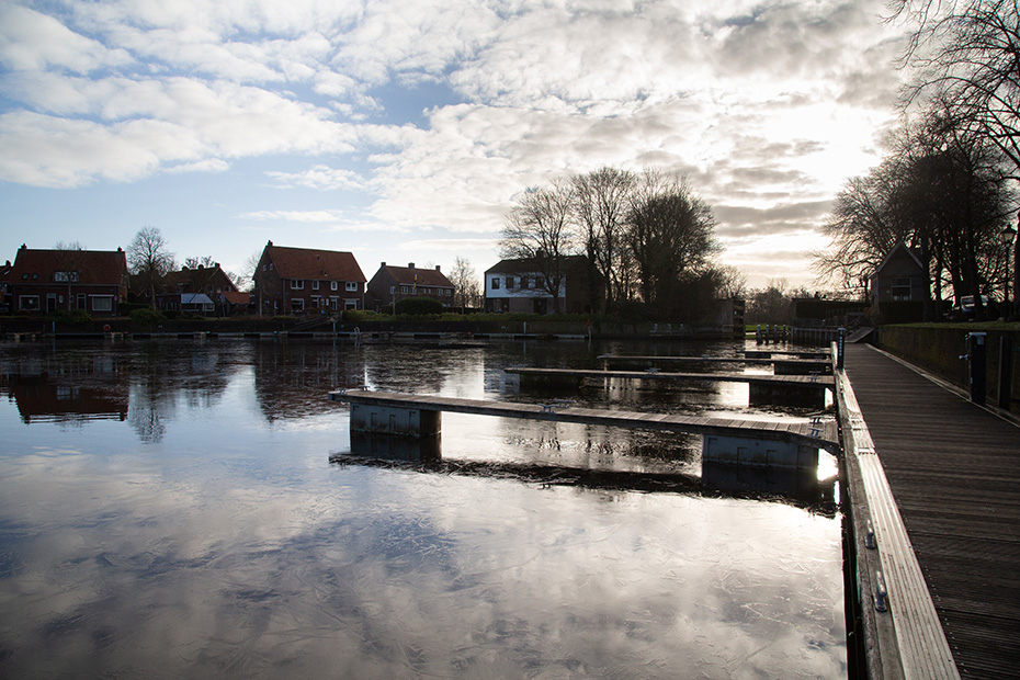 Via de aanlegsteiger wandelde ik richting het centrum van Blokzijl, langs de statige herenhuizen aan het water. Achterom kijkend, zag ik dat op de plekken waar het zonlicht niet was doorgedrongen, hier en daar nog een dun laagje ijs op het water lag.