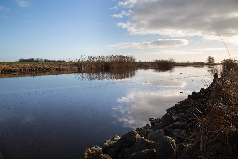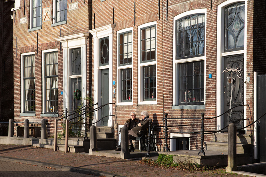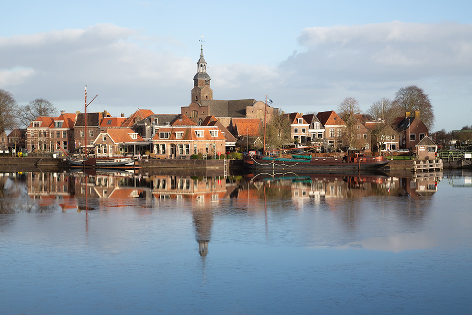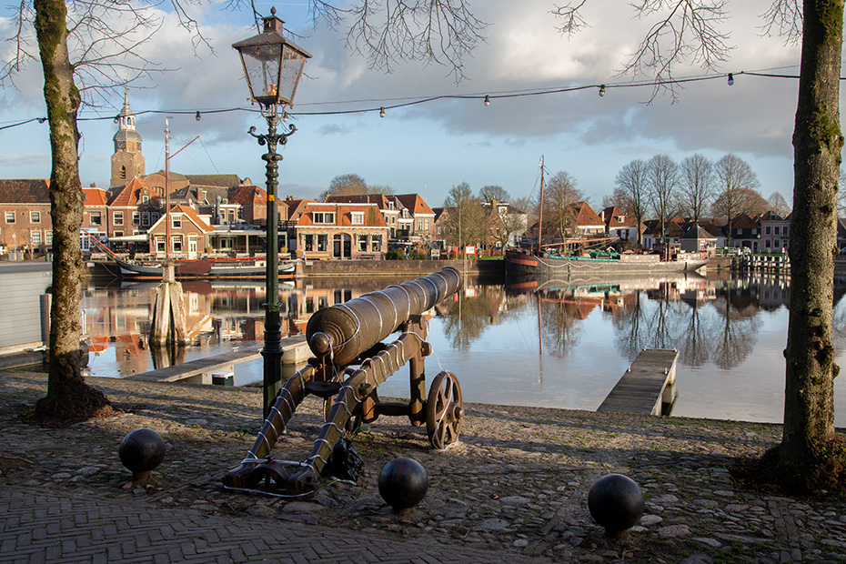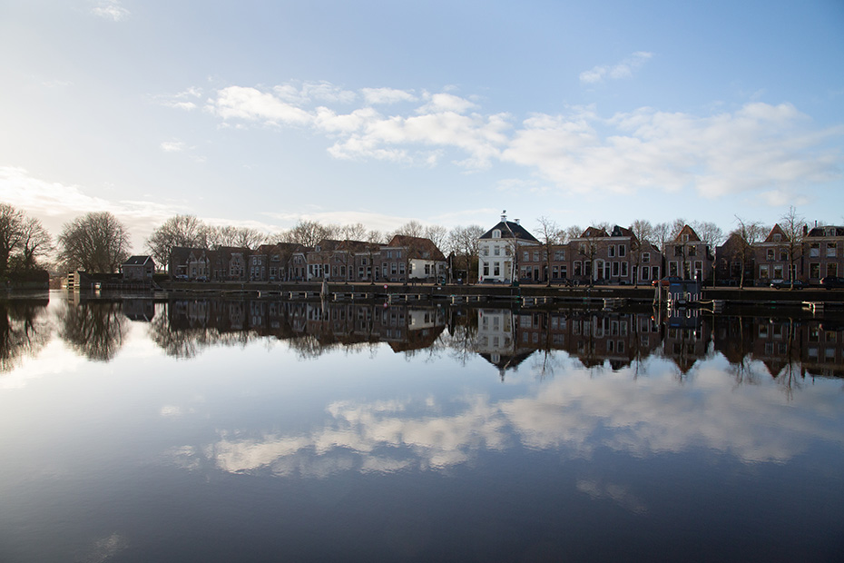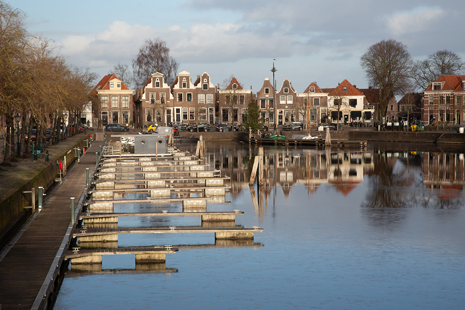 Via de aanlegsteiger wandelde ik richting het centrum van Blokzijl, langs de statige herenhuizen aan het water. Achterom kijkend, zag ik dat op de plekken waar het zonlicht niet was doorgedrongen, hier en daar nog een dun laagje ijs op het water lag.