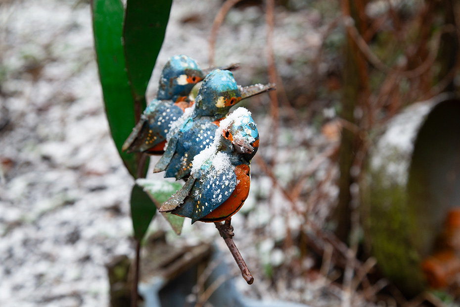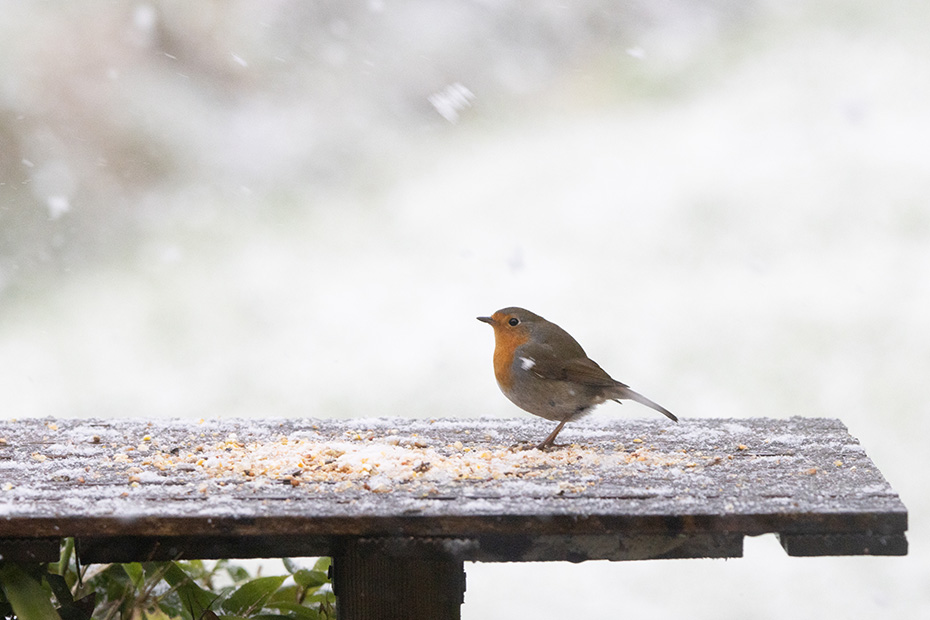 Mijn ervaring is dat tuinvogels meestal beschutting zoeken zodra het begint te sneeuwen. Voor het roodborstje gold dat echter niet. Het trotseerde onverstoorbaar de vallende sneeuwvlokken en had zo de voederplaats helemaal voor zichzelf.