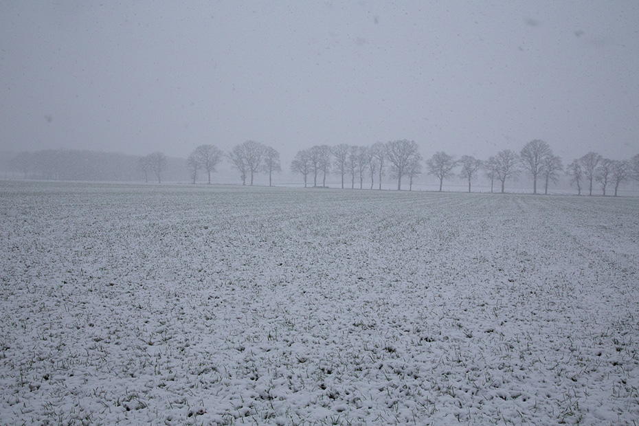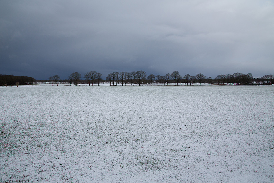 Toch stapte ik na het ontbijt in de auto. Als er sneeuw is gevallen, gaat mijn eerste uitstapje bijna altijd naar landgoed De Eese, zo ook vanochtend. Op de Koningin Wilhelminalaan maakte ik mijn eerste foto, in noordelijke richting. De buienradar had het al voorspeld, maar ook de lucht zelf liet duidelijk zien dat er opnieuw een bui in aantocht was.