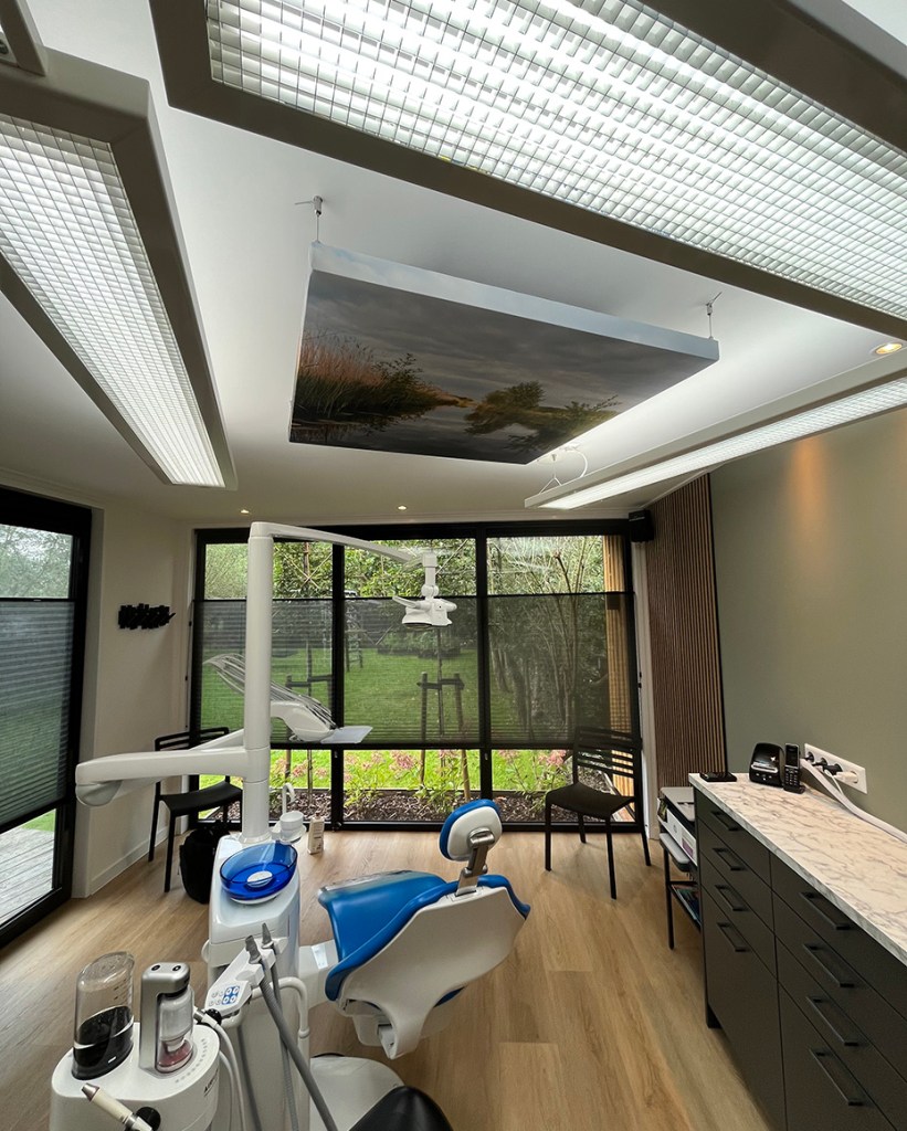 Een tijd geleden opende mijn mondhygiëniste een nieuwe praktijk in De Wieden. De ruimte is strak en modern ingericht, maar dat had als nadeel dat de akoestiek niet fijn was. Om dat probleem te verzachten wilde ze boven de behandelstoel een akoestisch paneel laten plaatsen.