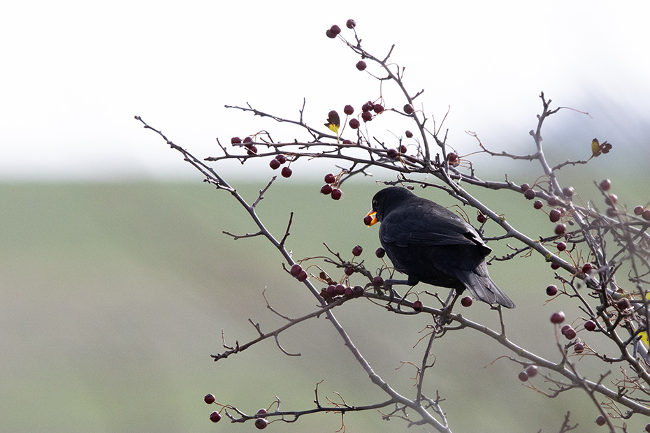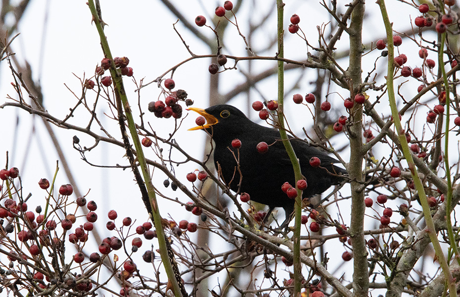 Merels en koperwiek snoepen van de bessen