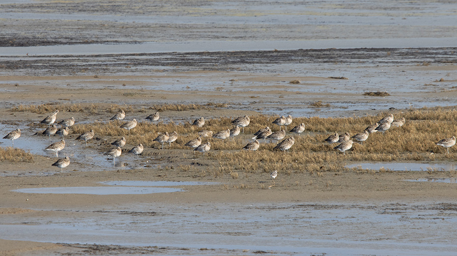 In de Mokbaai zat een grote groep vogels ineengedoken in hun veren te rusten. Met mijn telelens kon ik niet goed zien welke vogels het precies waren. Tot mijn schaamte moet ik bekennen dat de verrekijker helaas thuis lag. Af en toe hoorde ik de roep van een wulp, maar ik kon hem niet vinden. Pas toen ik thuis de foto’s op mijn computer bekeek, ontdekte ik dat het allemaal wulpen waren. 😉