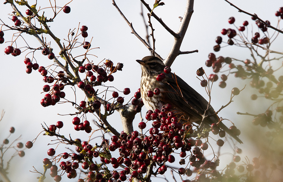 Vervolgens maakten we een prachtige wandeling langs de Horsmeertjes. Overal zagen we nog volop bessen aan de struiken hangen. Merels en koperwieken genoten zichtbaar van het overvloedige aanbod. Het was nog een hele kunst om ze tussen de takken door acceptabel op de foto te krijgen.