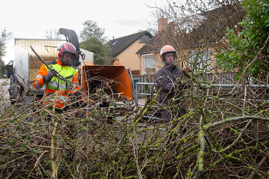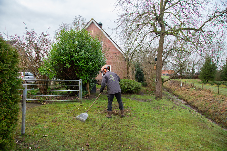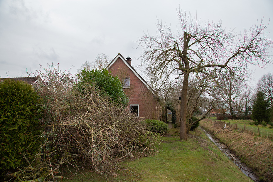 Deze vier mensen hebben enorm veel werk verzet. Het resultaat van al dat snoeiwerk lag uiteindelijk in vijf grote hopen, verspreid over de voor- en achtertuin. In de dagen erna heb ik alle takken naar voren gesleept. In twee sessies van anderhalf uur en ruim 22.000 stappen verder kreeg ik alles op één plek. Takken van fruitbomen zijn berucht: ze grijpen in elkaar, haken vast en werken je bij elke stap tegen. Een paar dagen later kwamen twee mannen met een versnipperaar. Binnen een half uur hadden ze de grote bult weggewerkt en het terrein netjes opgeleverd!
