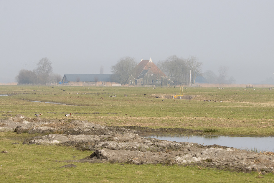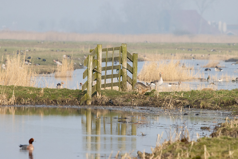 Ik zoomde in op het hek in de verte en zag op dat moment een haas voorbij huppen. Even later verscheen er een wandelaar, die bleef staan voor een praatje. Hij wees mij op de boerderij waar hij was opgegroeid – te zien op de tweede foto – en vertelde over zijn jeugd in dit gebied. Zijn ouders moesten stoppen met boeren vanwege het weidevogelgebied en verhuisden naar een boerderij in Flevoland. Zelf was hij weer teruggekeerd naar Fryslân en maakte nog steeds graag wandelingen in dit gebied, om te genieten van de weidevogels.
