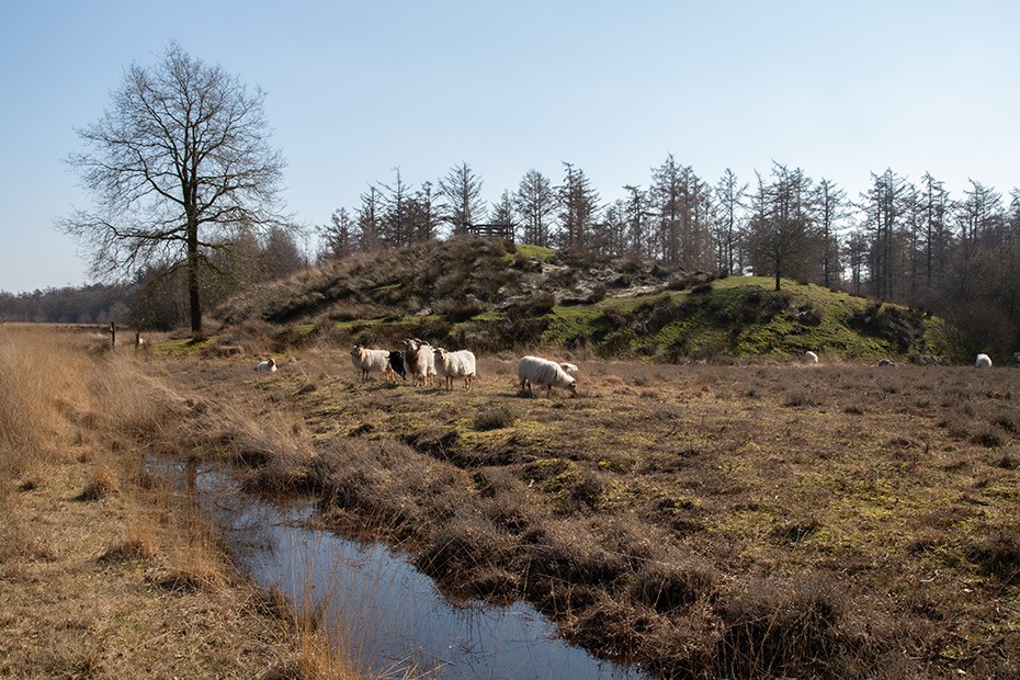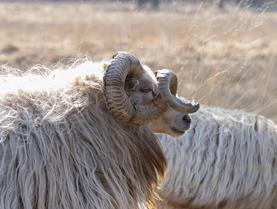 Het gebied wordt begraasd door een ongescheperde kudde Drentse heideschapen. “Ongescheperd” betekent dat er geen schaapsherder aanwezig is om de kudde te begeleiden. Het exemplaar met de gekrulde hoorns is een ram, een imposante verschijning in het landschap.