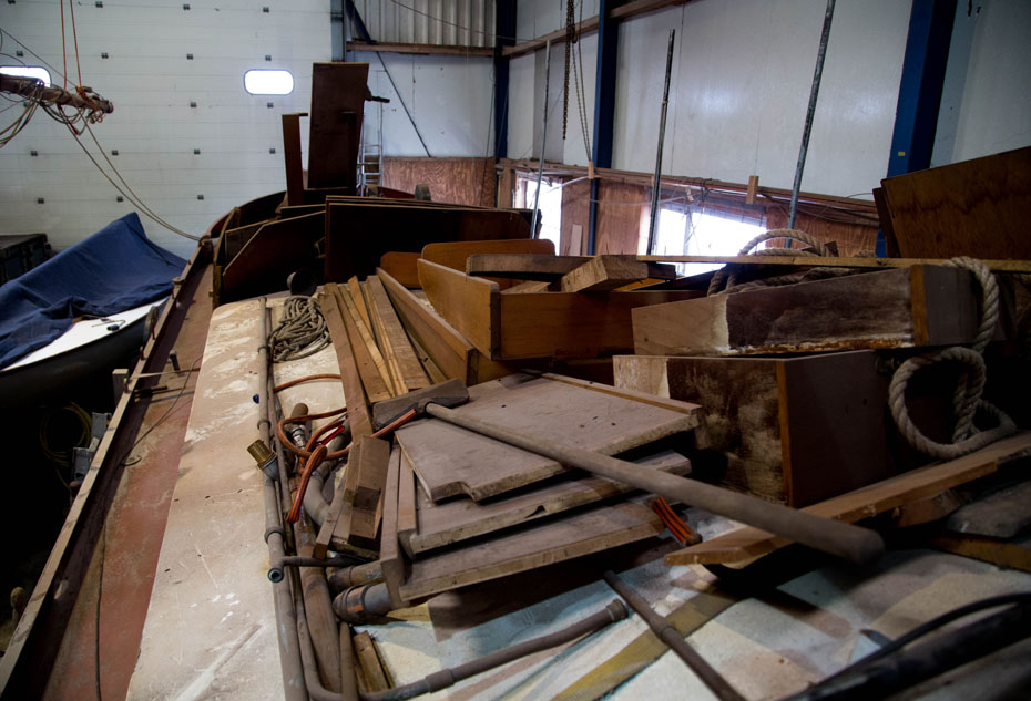 Bijna alle betimmering is verwijderd. Alle onderdelen worden bewaard en zoveel mogelijk hergebruikt. Alle oude verflagen zijn van het casco verwijderd en alle spanten zijn vervangen. Dit was een immense klus. Het is belangrijk werk waar je later niets van terugziet. Klik op de foto’s voor groot formaat.