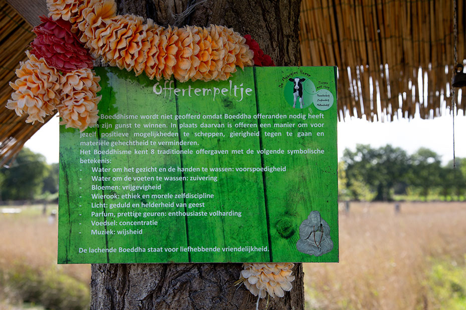 Het offertempeltje is gericht op het boeddhisme. Dat kan ook niet missen met het enorme Boeddhabeeld naast het tempeltje. Als volgeling van Christus ben ik niet goed op de hoogte van het boeddhisme, toch kan ik mij wel vinden in de meeste punten die op het bordje staan vermeld…